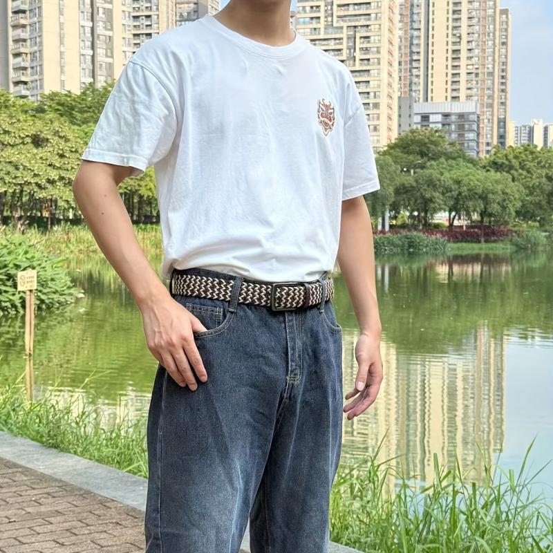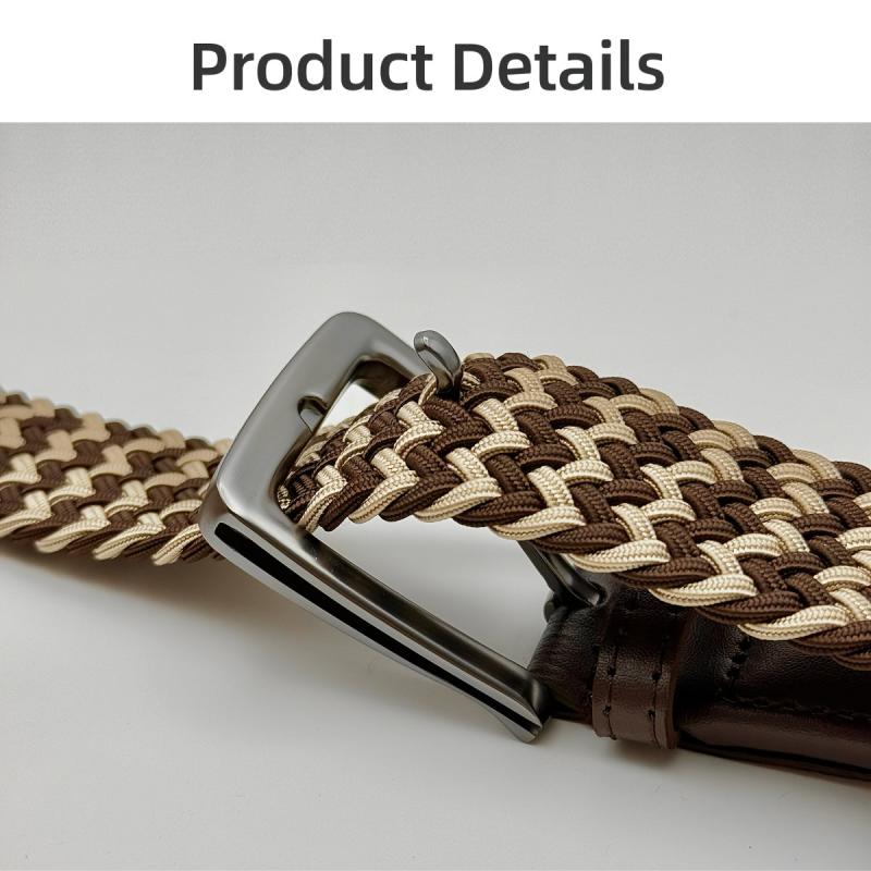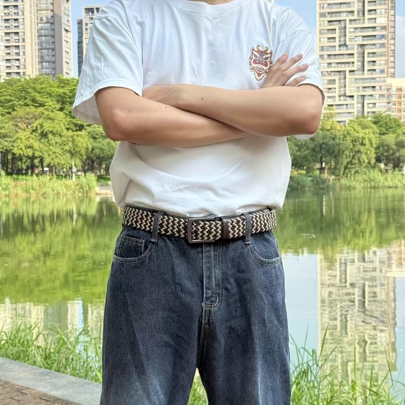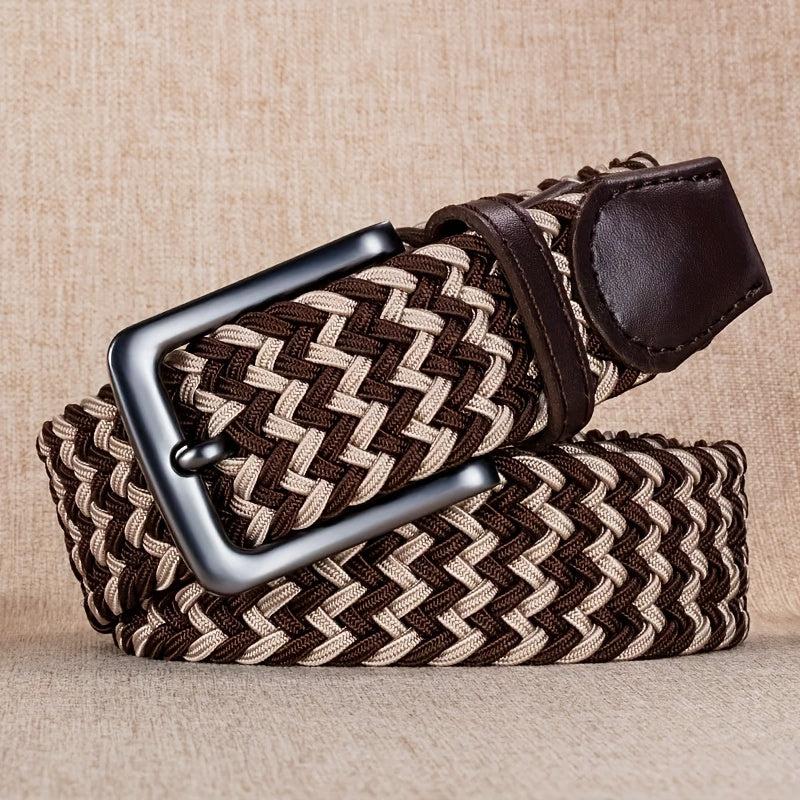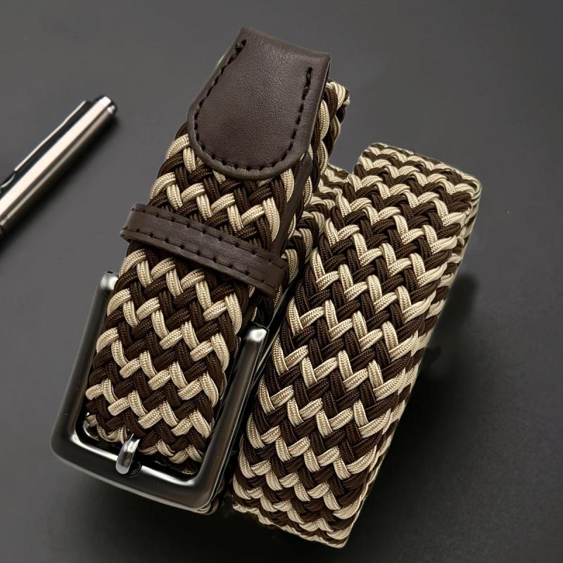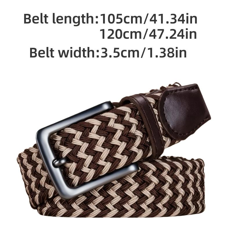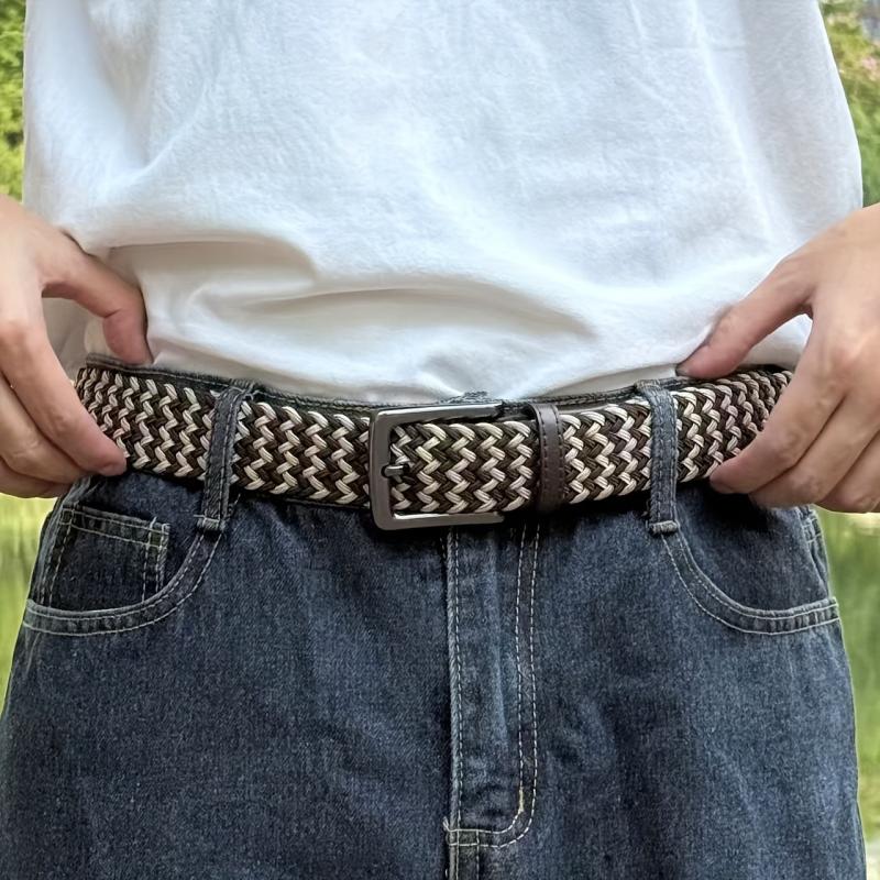 This men's elastic woven belt features an alloy buckle and provides a comfortable fit for jeans. It is adjustable and stylish, perfect for everyday wear.