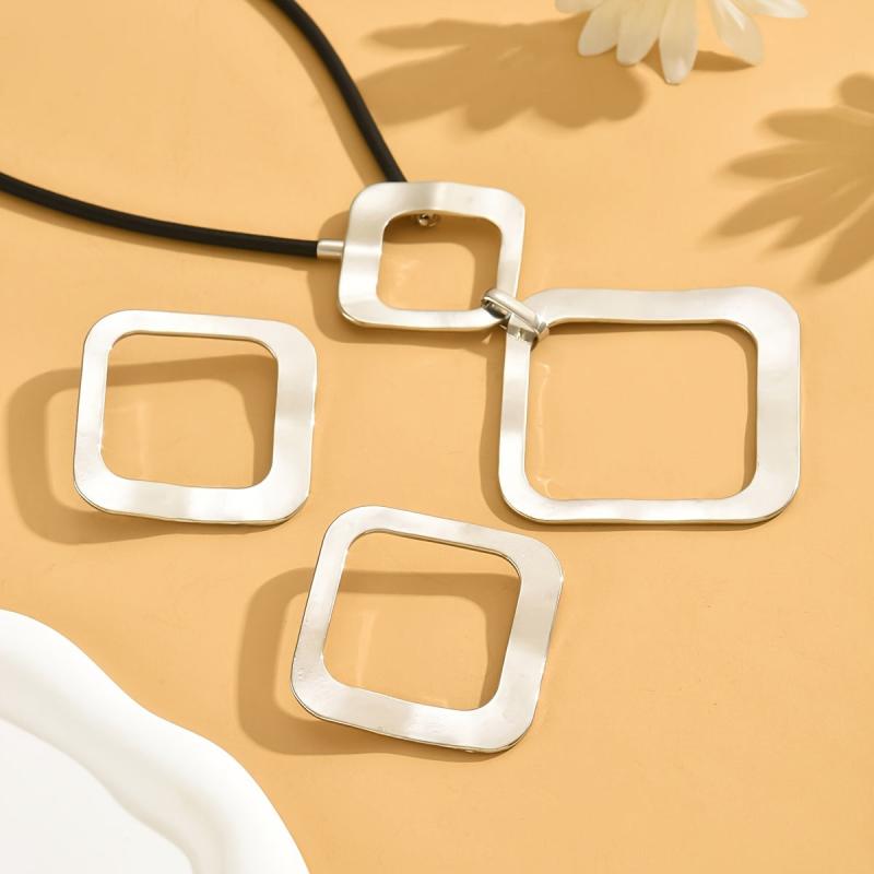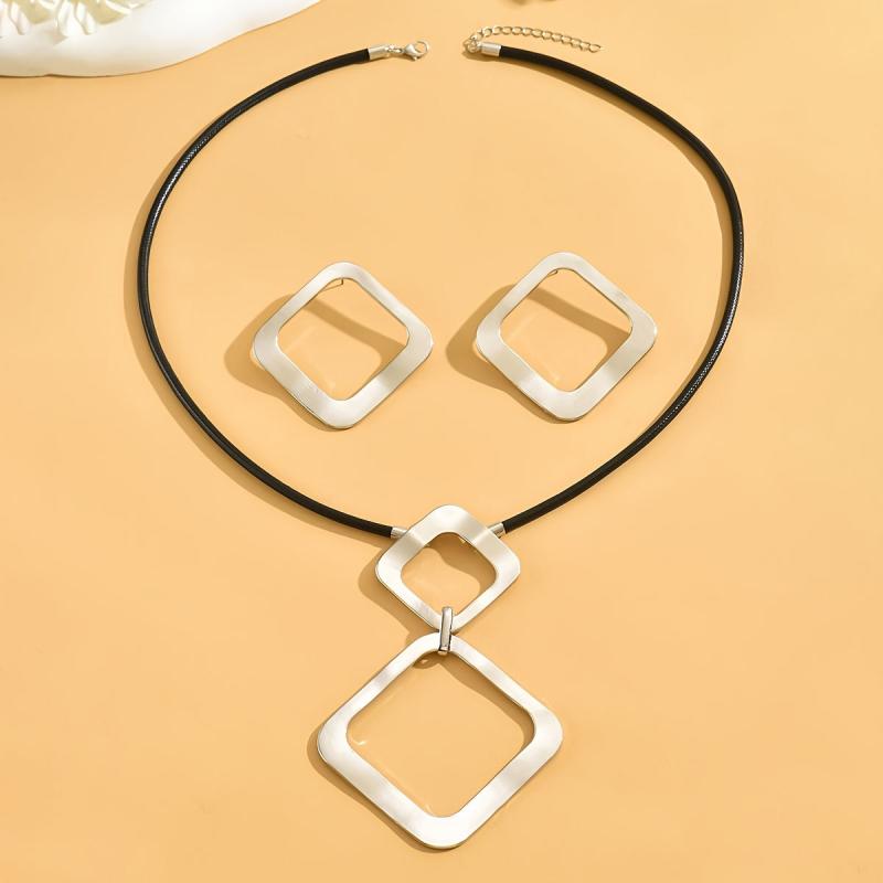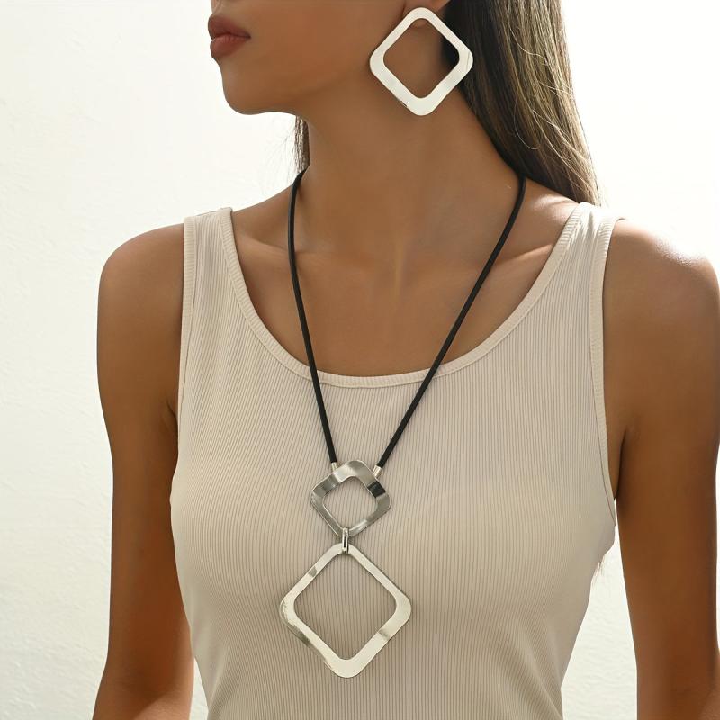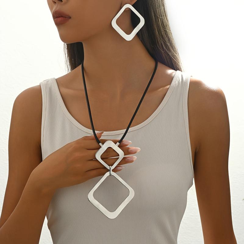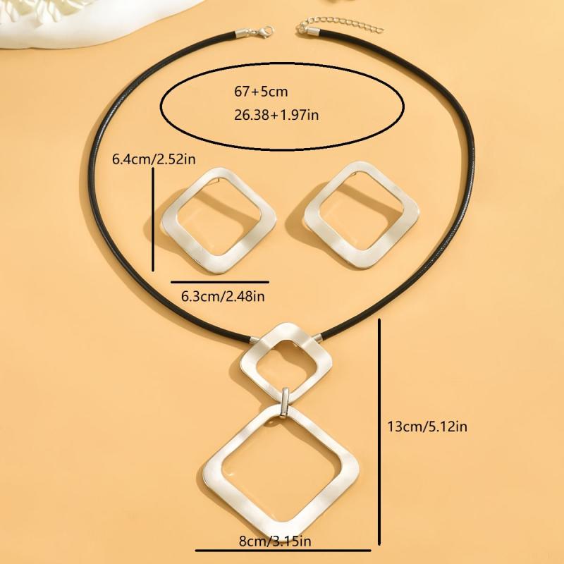 Complete your look with this elegant two-piece set featuring a rhombus geometric pendant. The necklace and earrings are adorned with minimalist rope beads for a sleek and stylish touch.