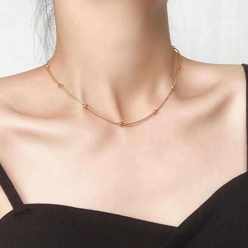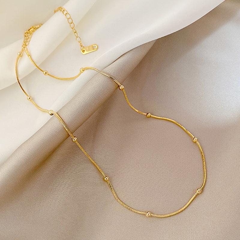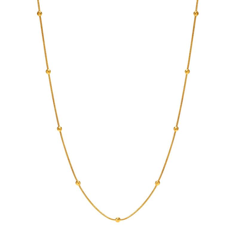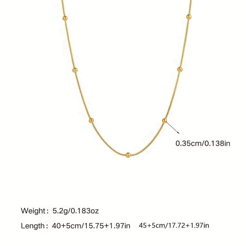 This stylish necklace is perfect for parties, vacations, Mardi Gras, and everyday wear. Made of high-quality titanium steel, it features a snake chain design with golden tone beads.