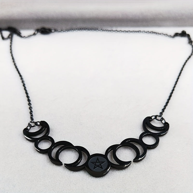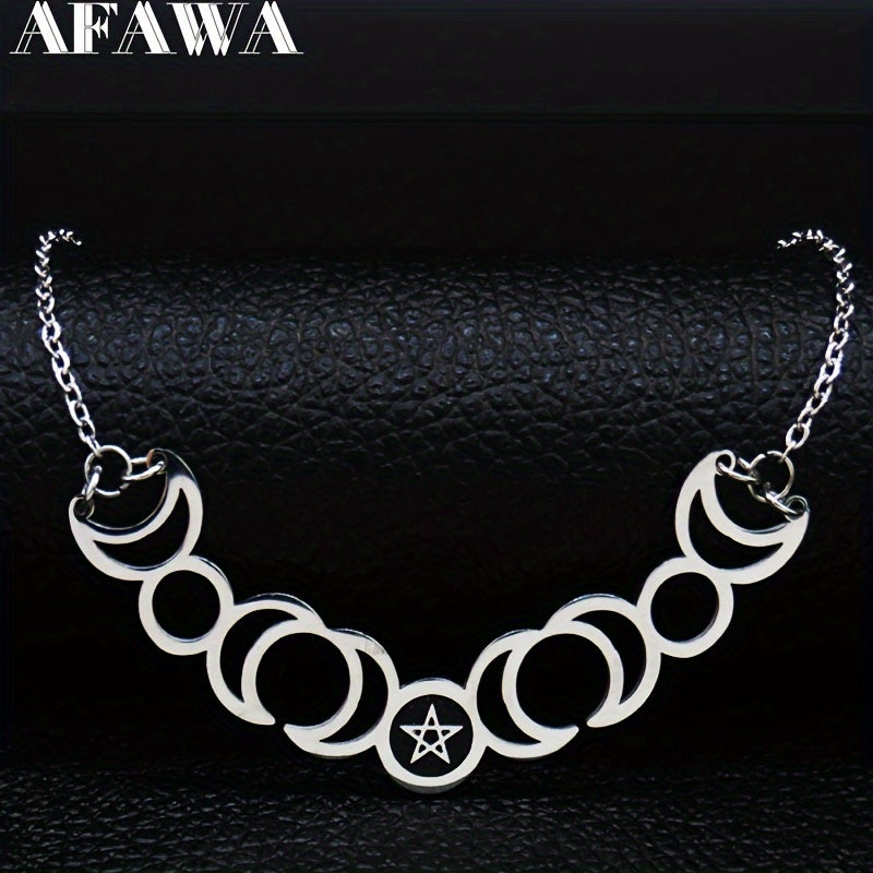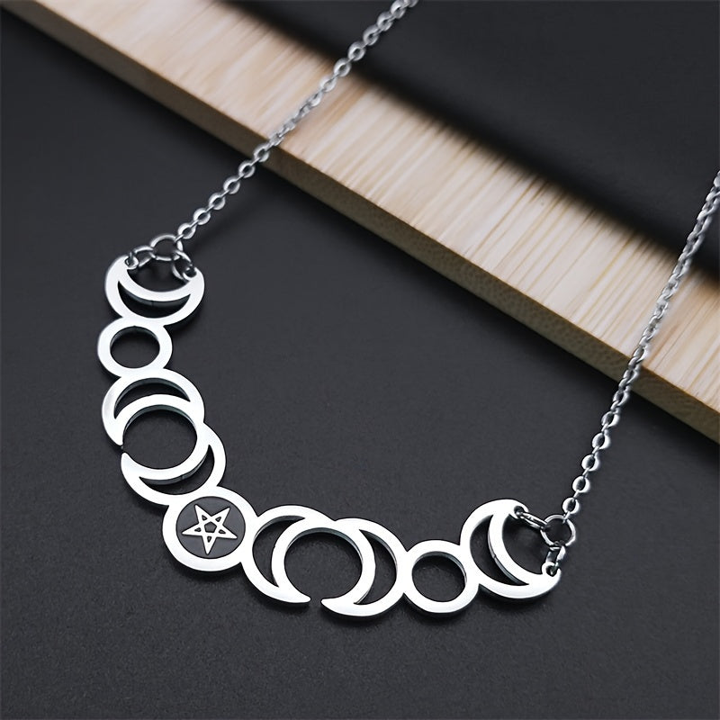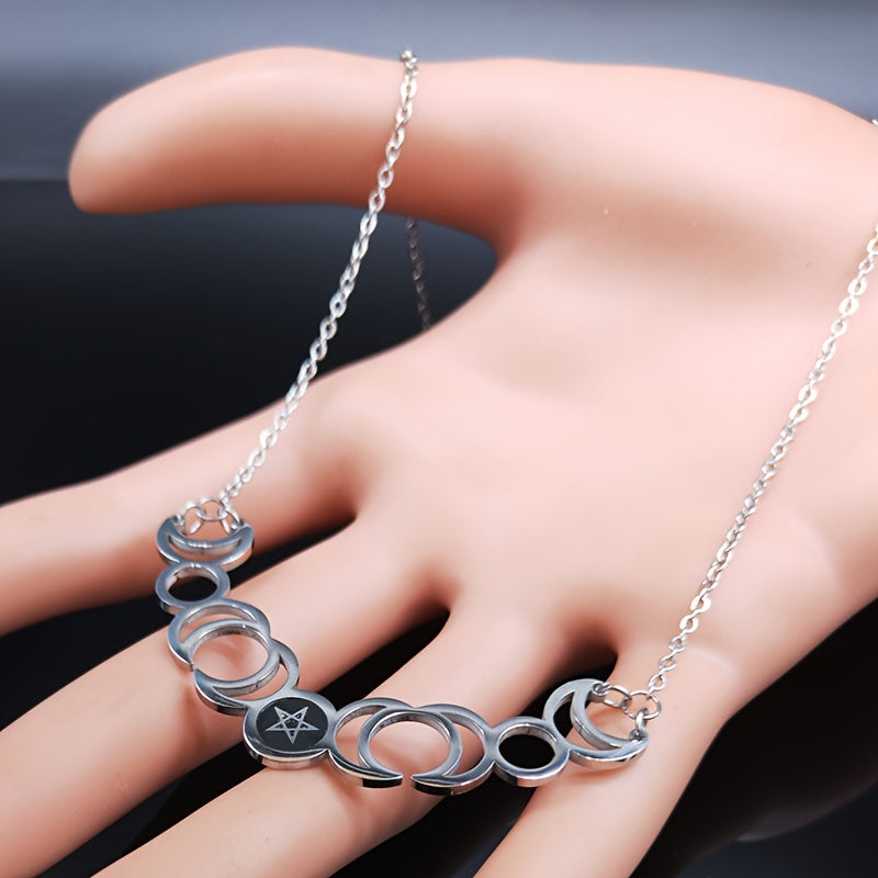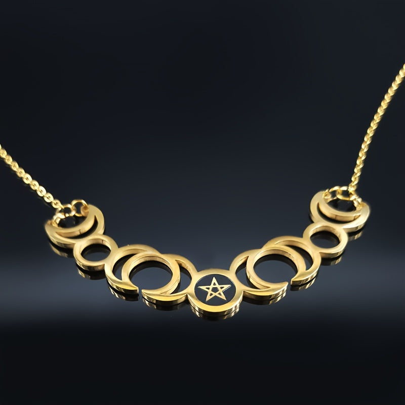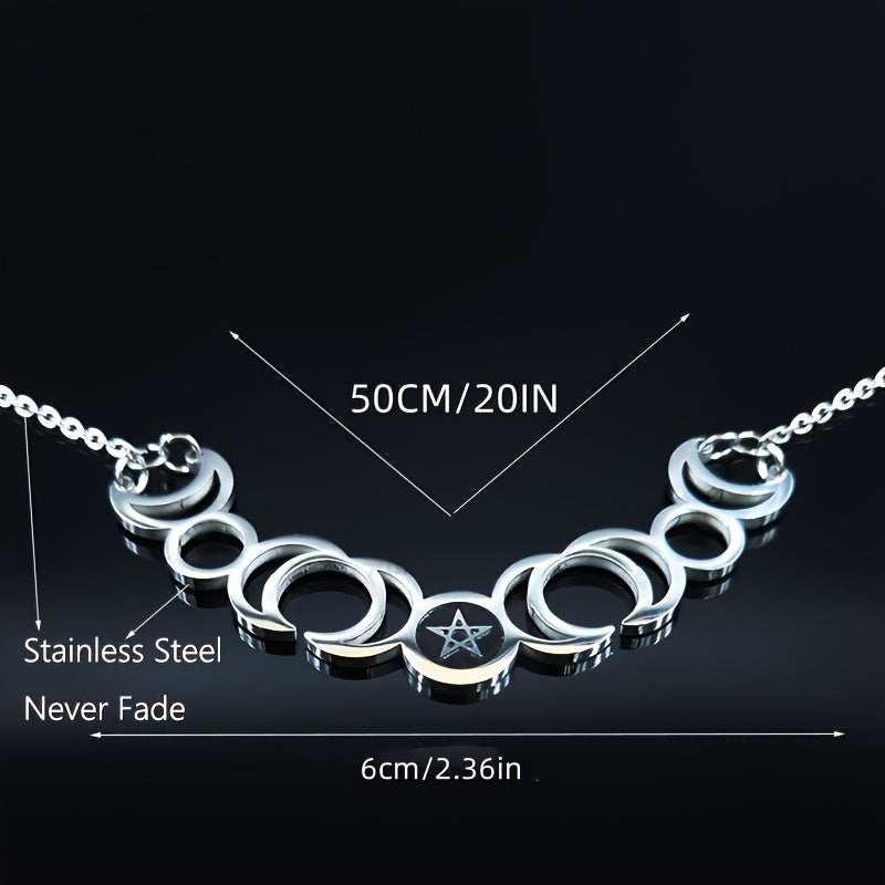 Elegant stainless steel necklace featuring the triple moon goddess, sun, and pentagram symbols. Perfect accessory for witches and those who love mystical jewelry.