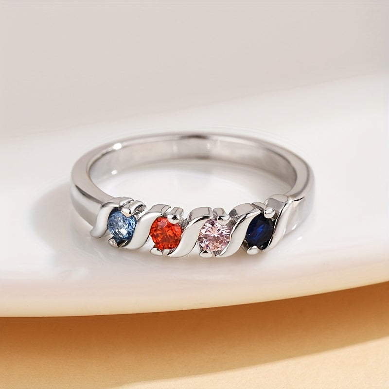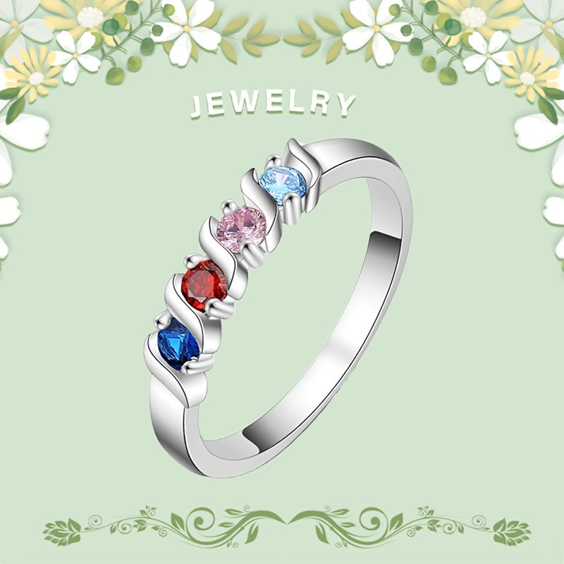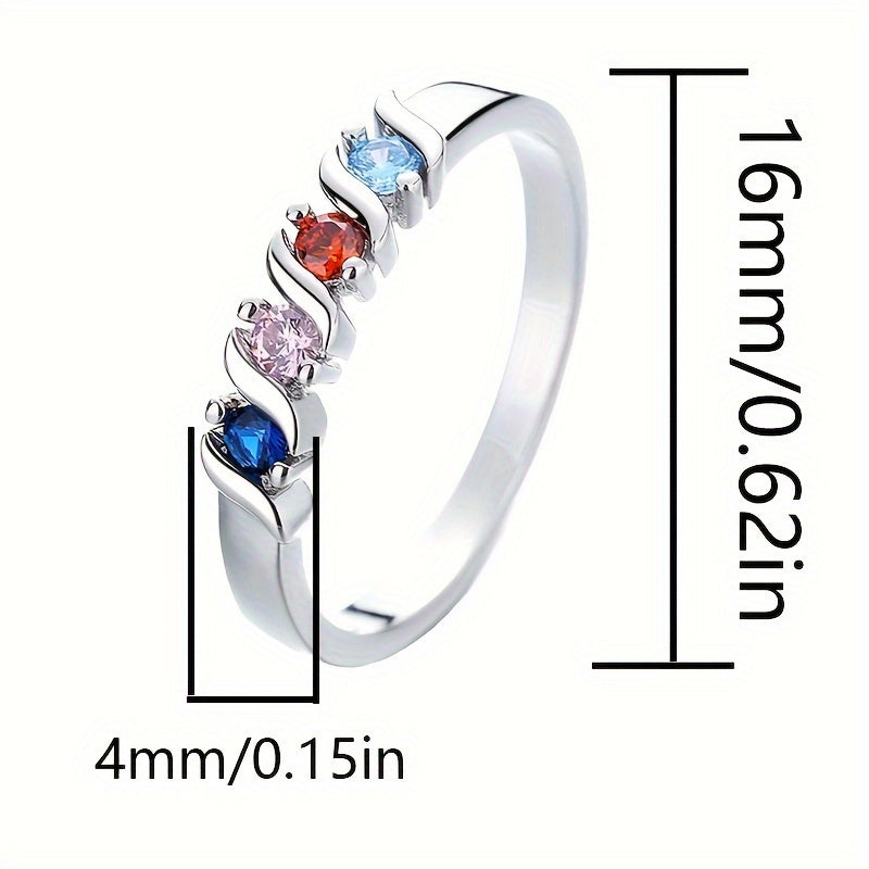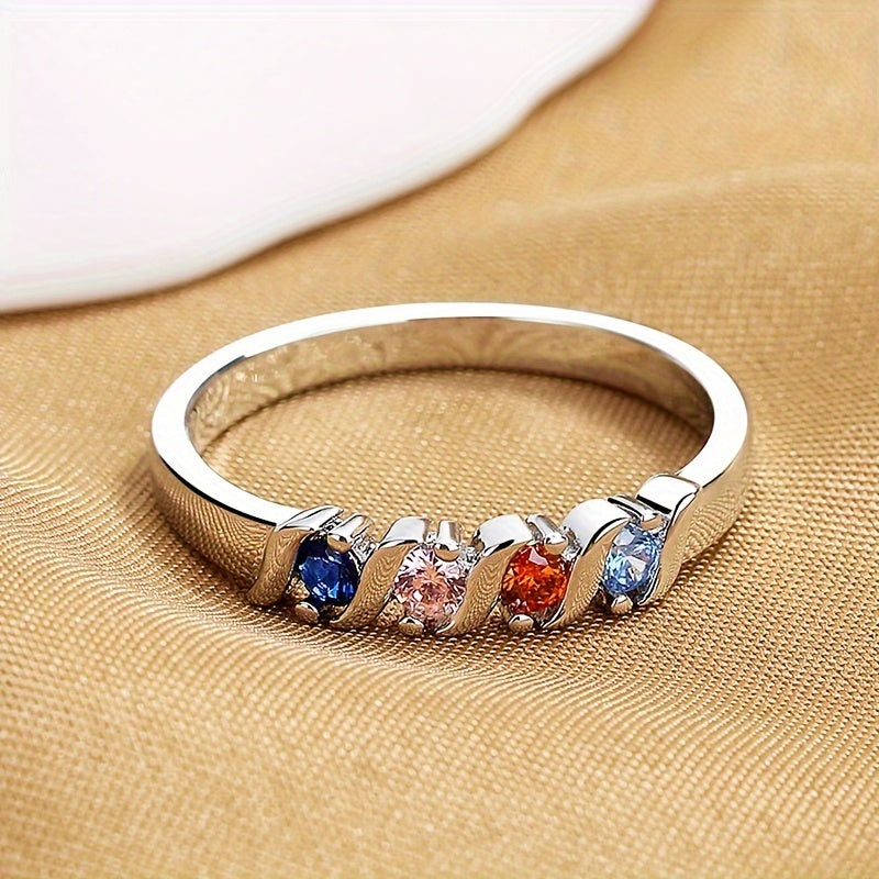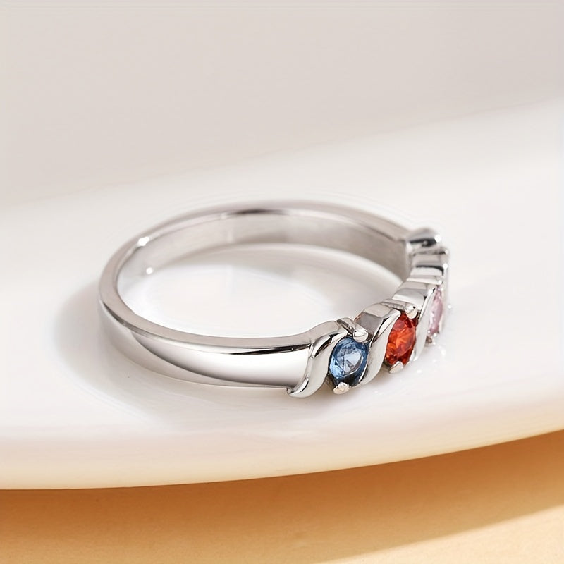 Elegant and vibrant, this silvery ring features multicolor cubic zirconia set in a geometric design. Perfect as a promise ring or family jewelry.
