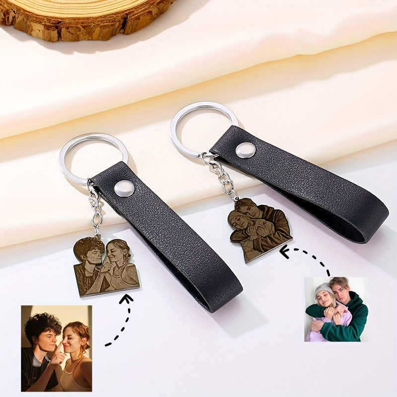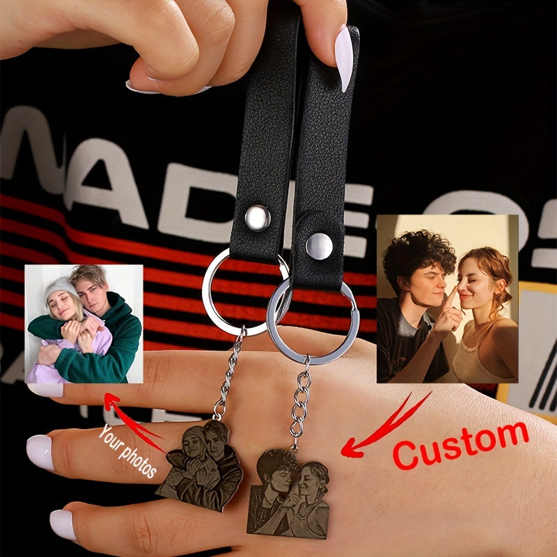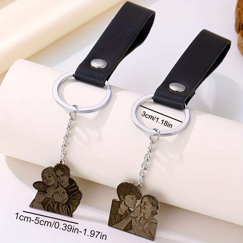 Capture your favorite moments with this custom engraved photo keychain. Made of stainless steel, it features a personalized portrait charm with a leather strap. Perfect for couples, families, friends, and pet lovers.