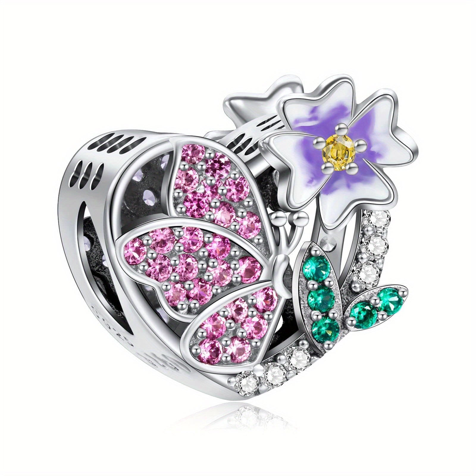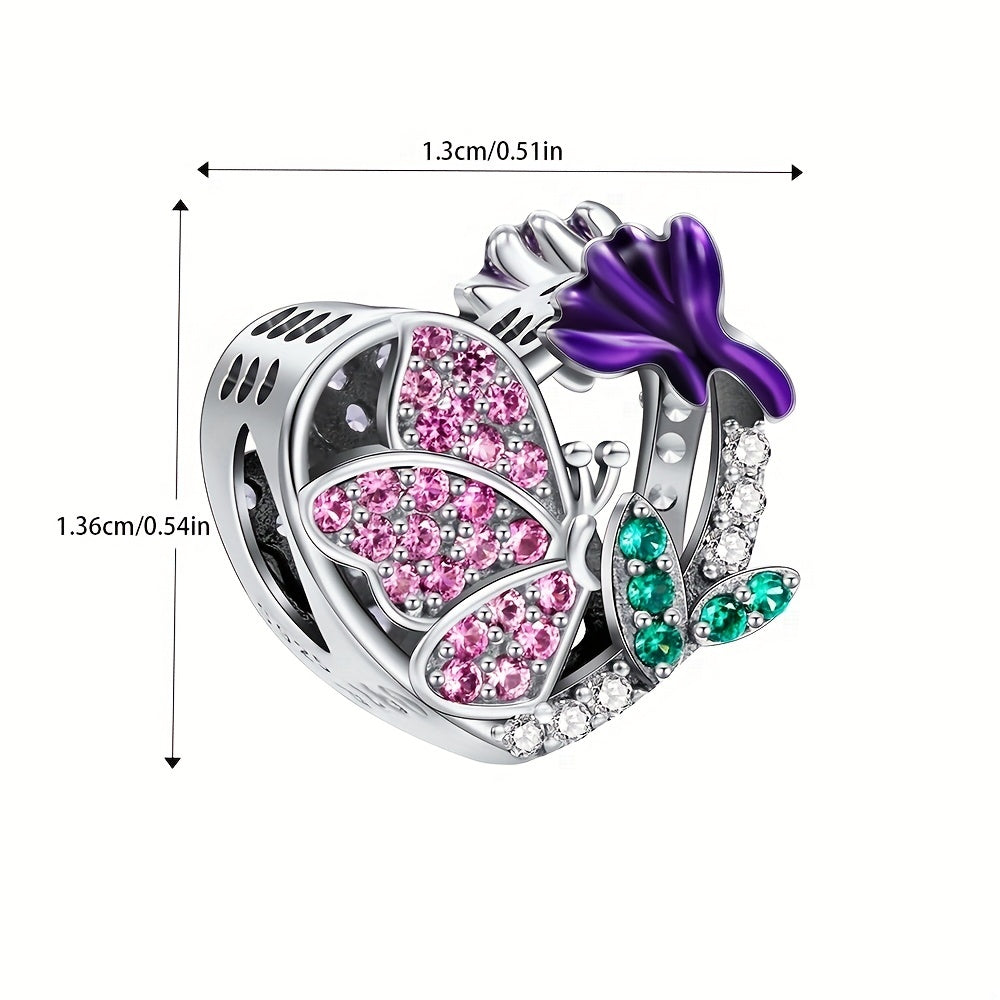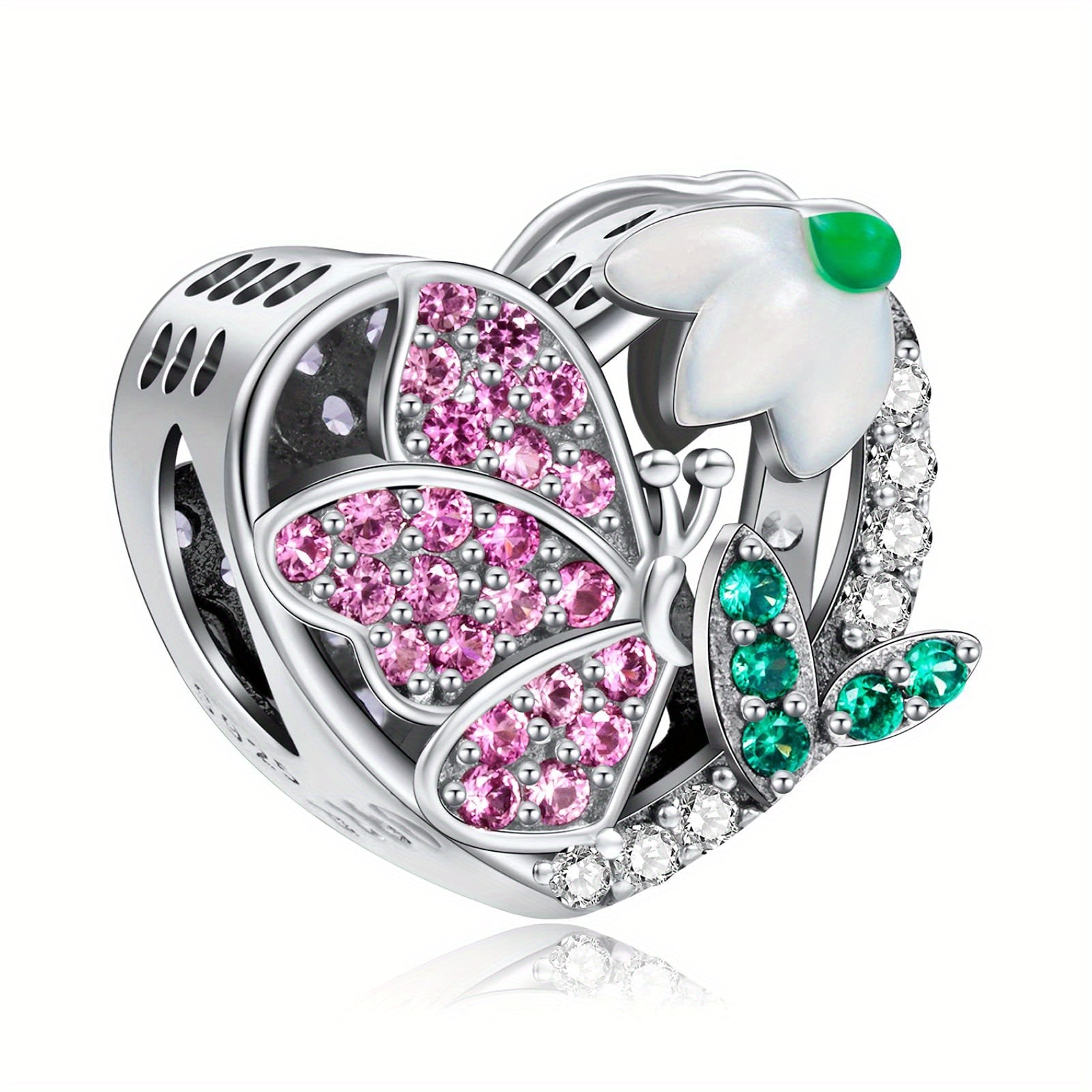 Add a touch of elegance to your creations with this heart-shaped large hole bead featuring a pink rhinestone butterfly and colorful enamel flower design. Perfect for bracelets and necklaces.