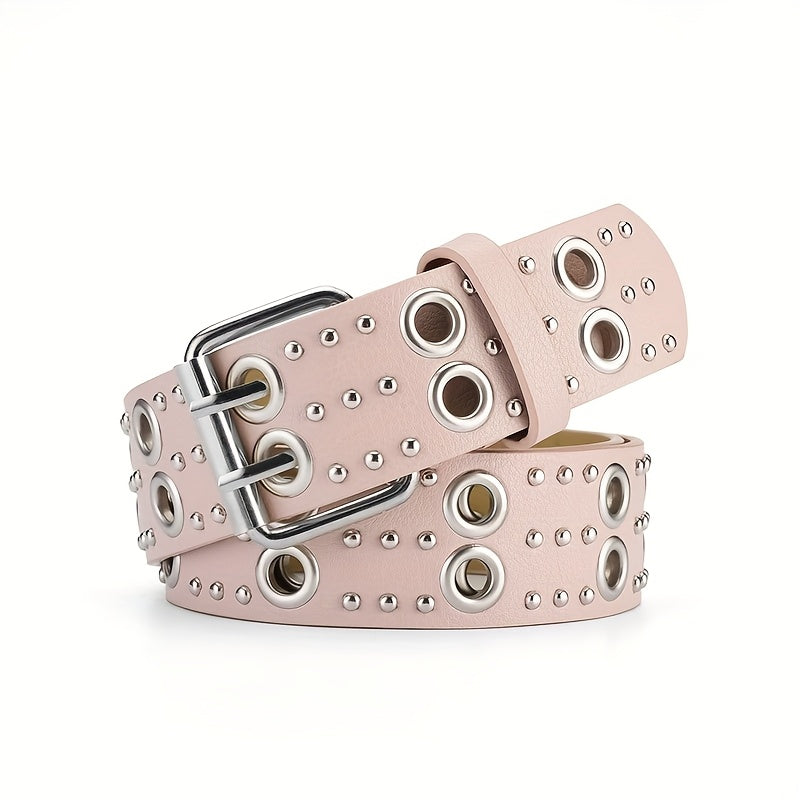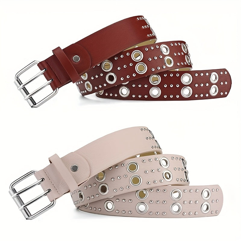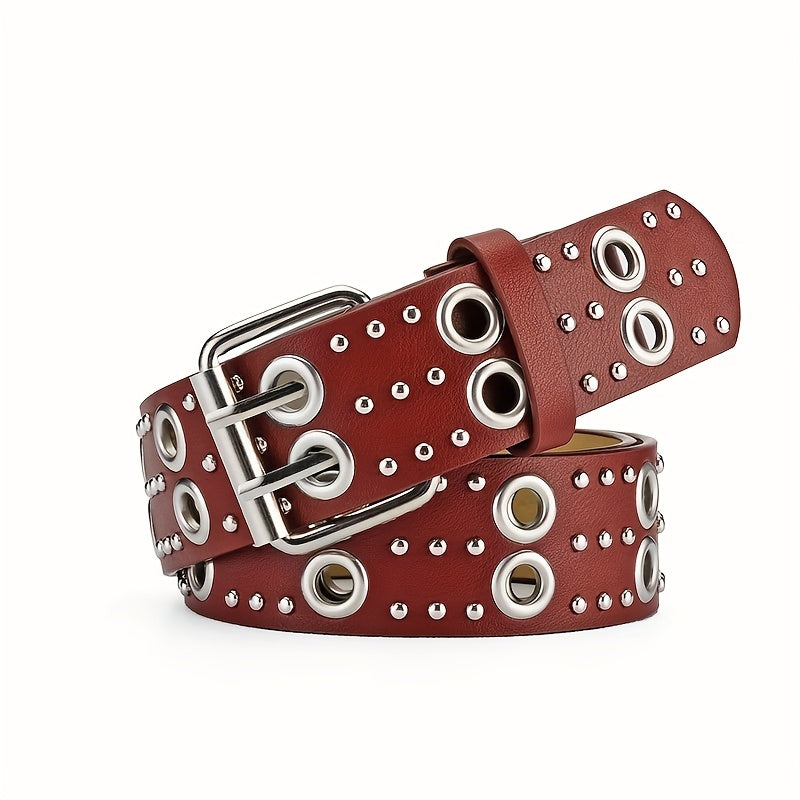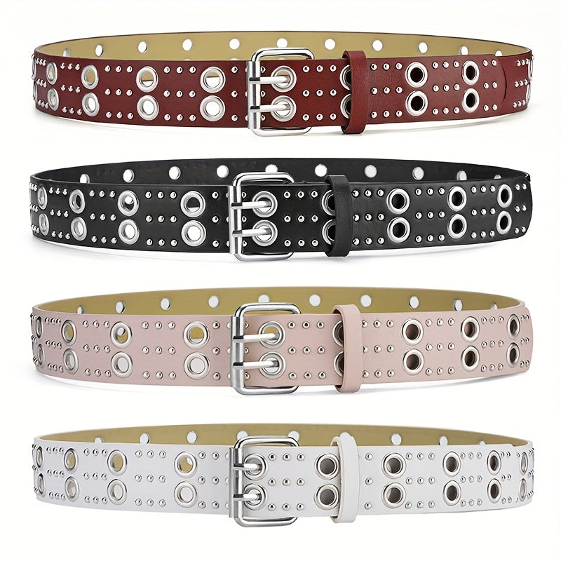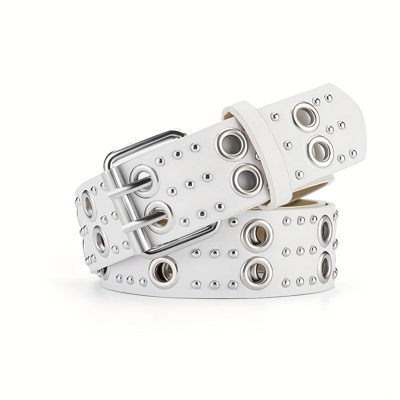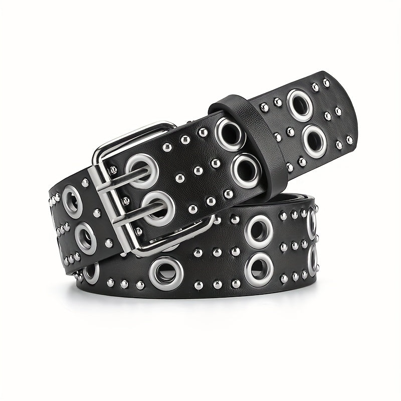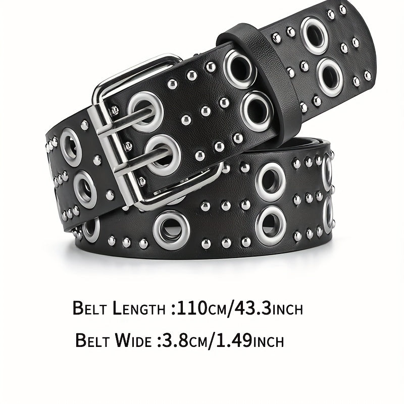 Add an edgy touch to your outfit with this punk style belt. Made of faux leather with a double row of hollow rivets and an iron buckle, this belt is perfect for men and women looking for a street style accent.
