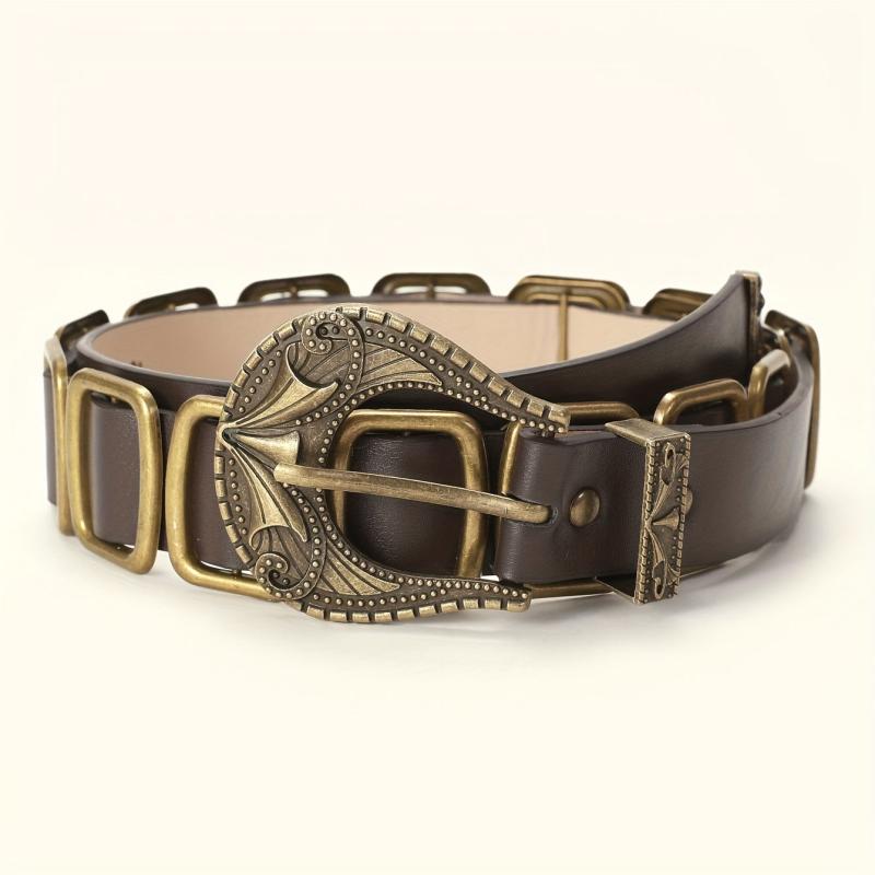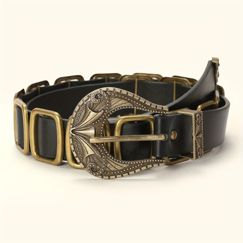 This edgy belt features a golden contrast block with a metallic buckle, perfect for adding a touch of punk, bohemian style to your outfits. Ideal for casual parties, weddings, and daily wear.