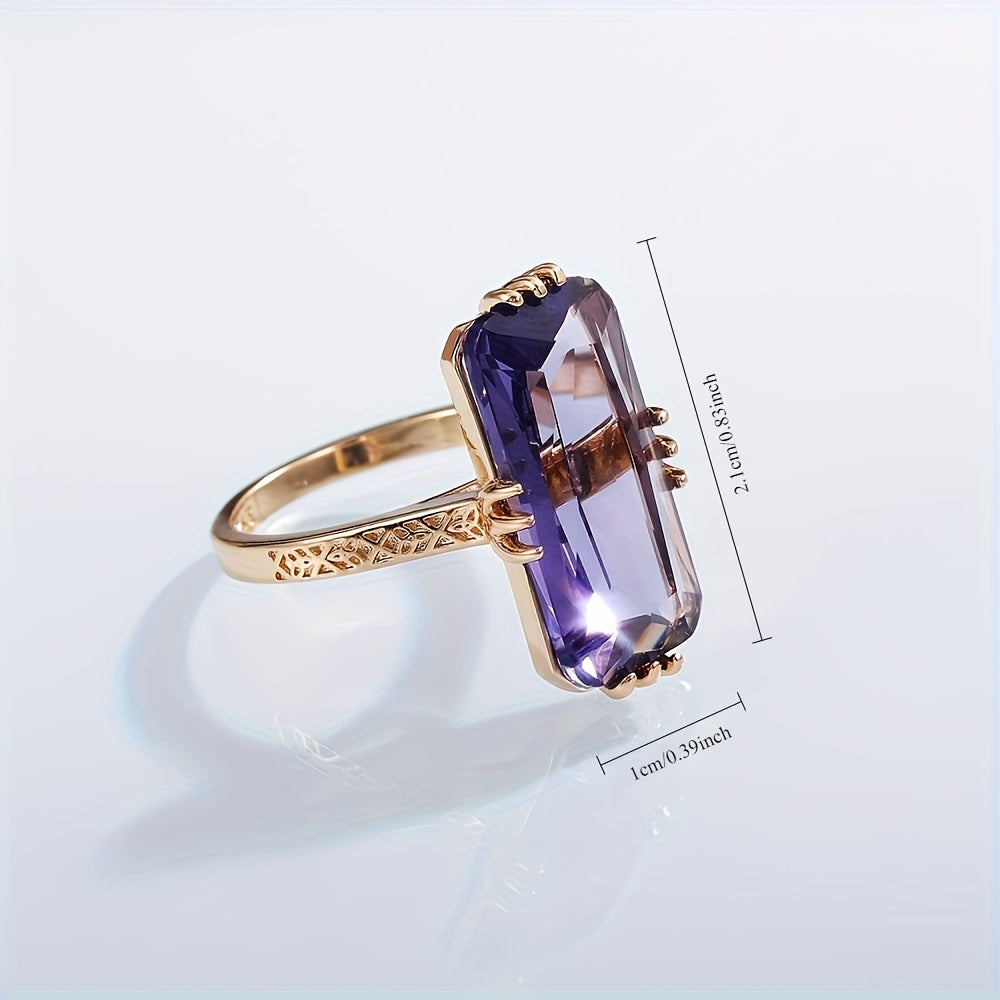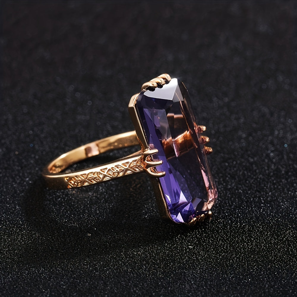 This stunning ring features a purple gradient geometric design on golden tone metal, perfect for weddings, engagements, and parties.