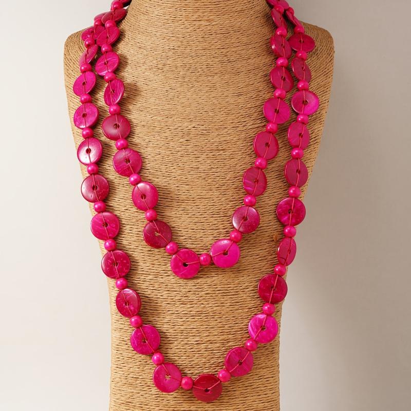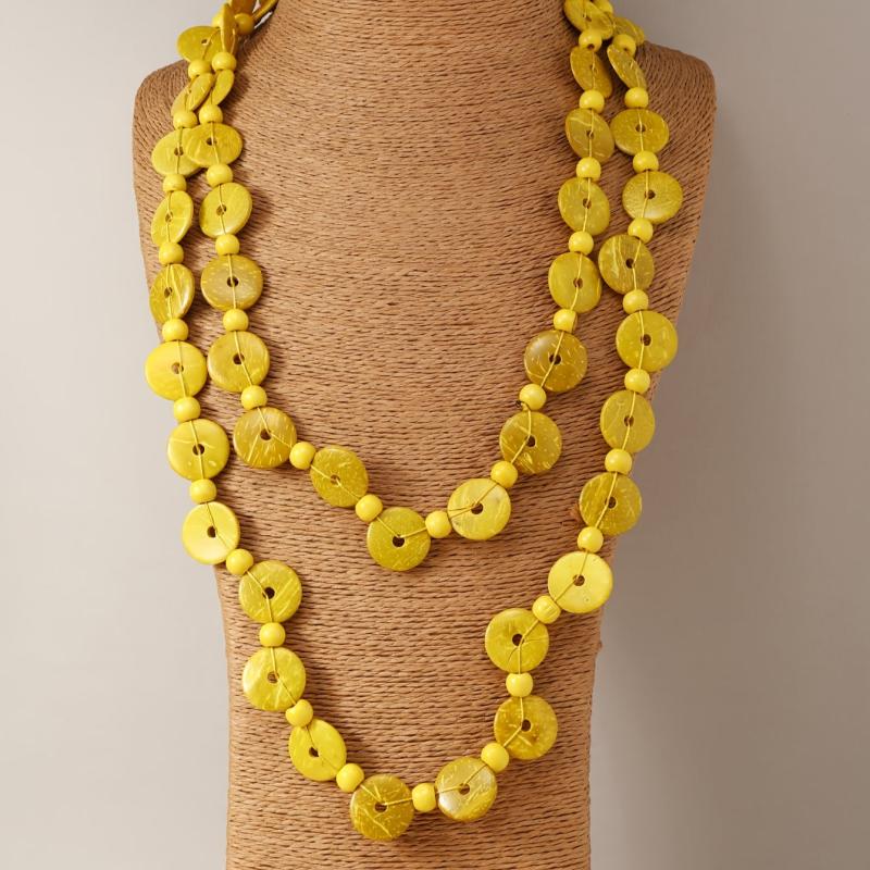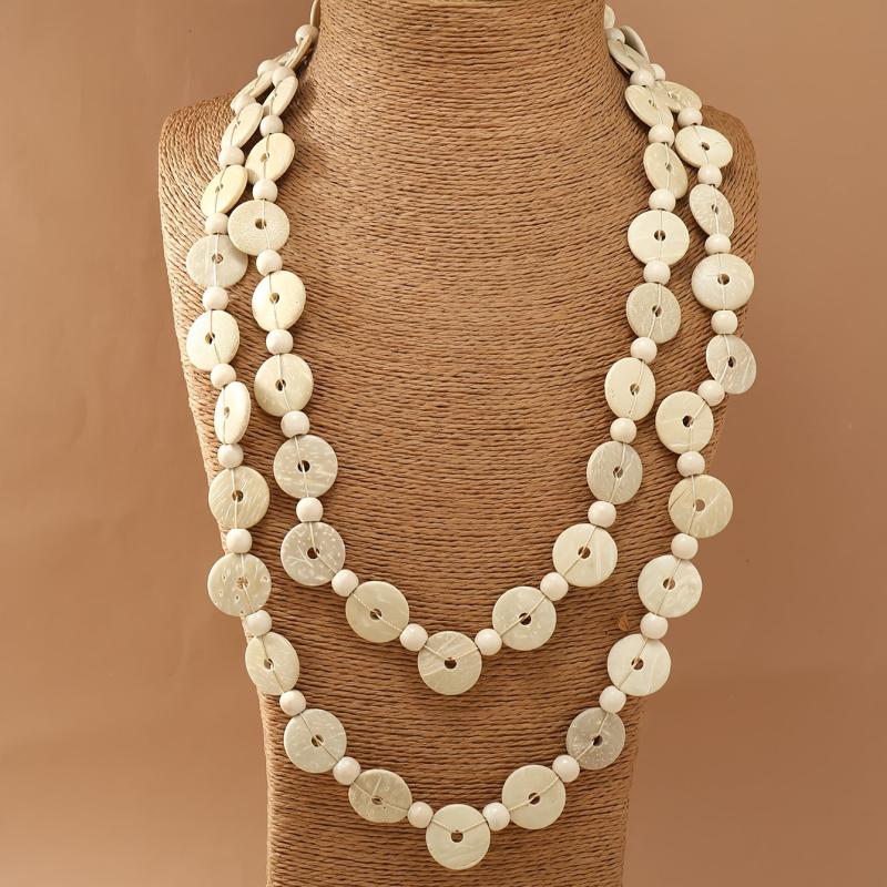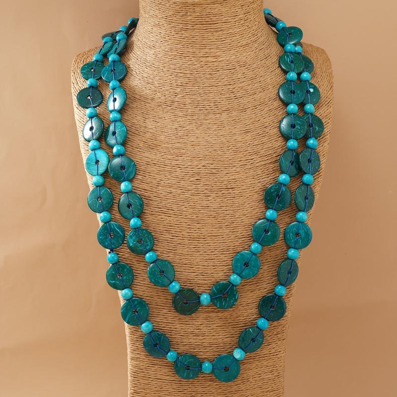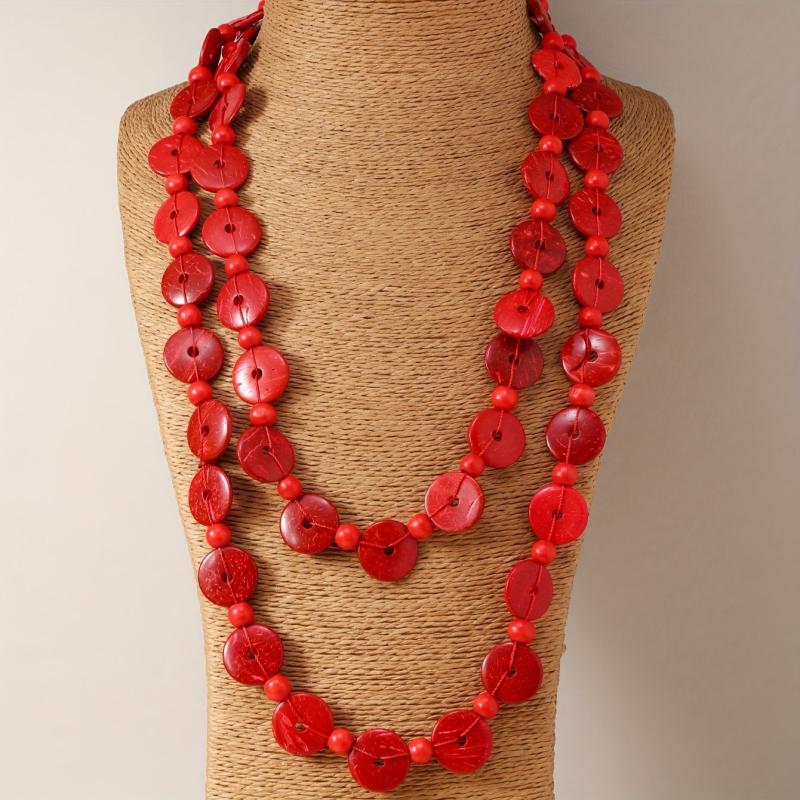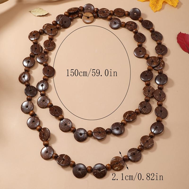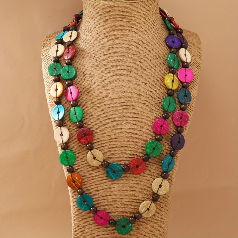Elevate your look with this bohemian recycled coconut wood bead necklace. Perfect for high & casual attire, this statement jewelry adds a touch of tropical vintage charm to your outfit. Ideal for festive occasions and a natural accessory.