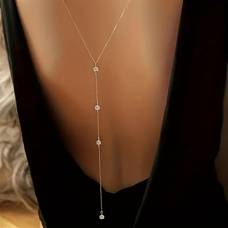 Elevate your backless dress with this sexy body chain featuring rhinestones. Stand out and make a statement.