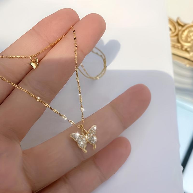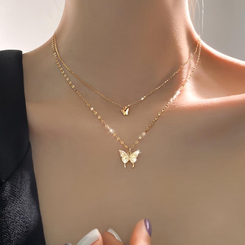 This unique necklace features a sparkling butterfly design on a double layered chain for a stylish look.