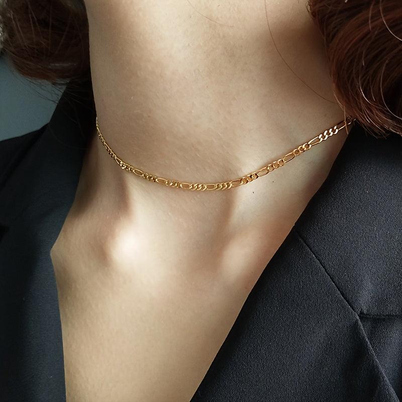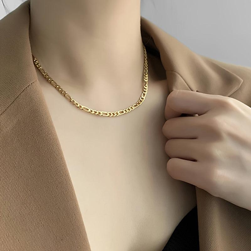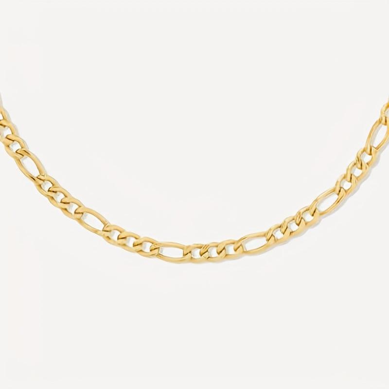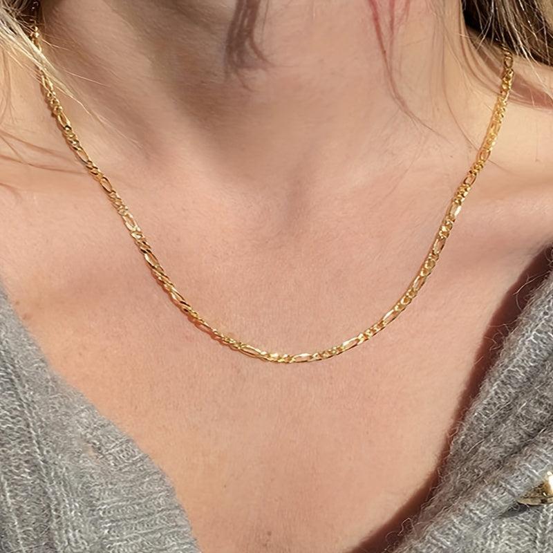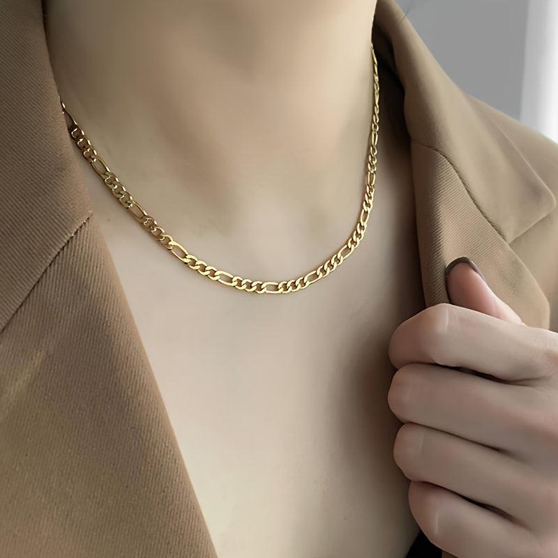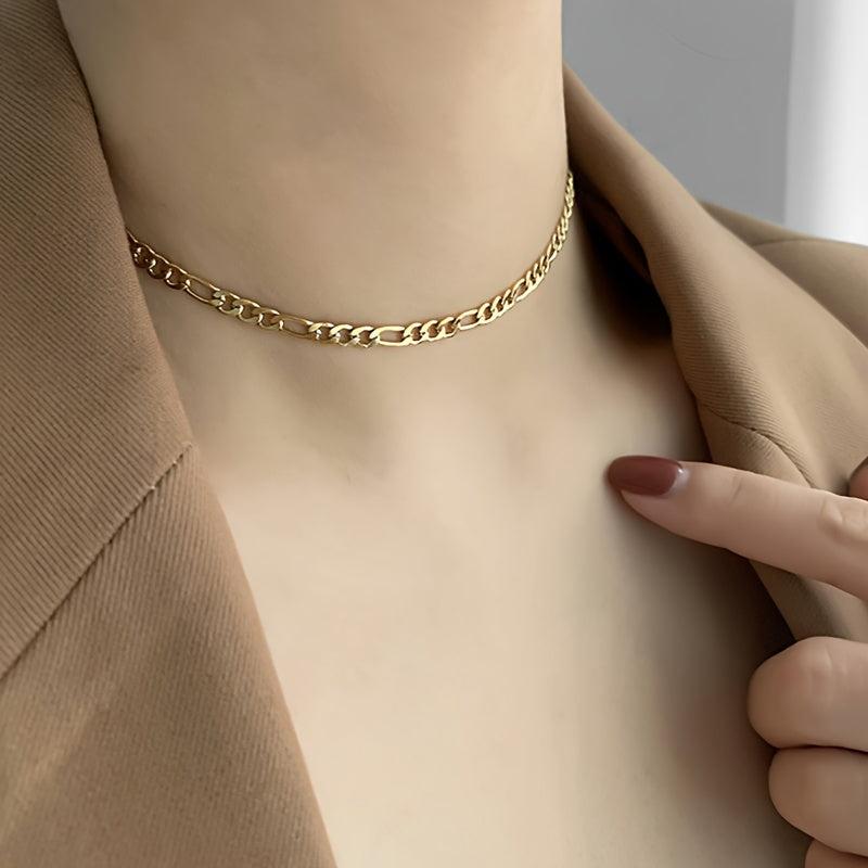This minimalist chain necklace features a fine link design in a durable stainless steel material with a golden tone finish. Elegant and versatile for everyday wear.