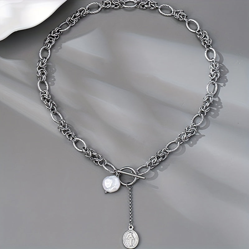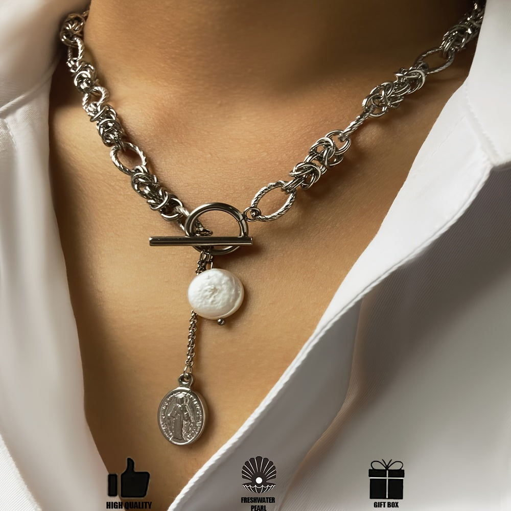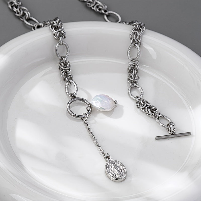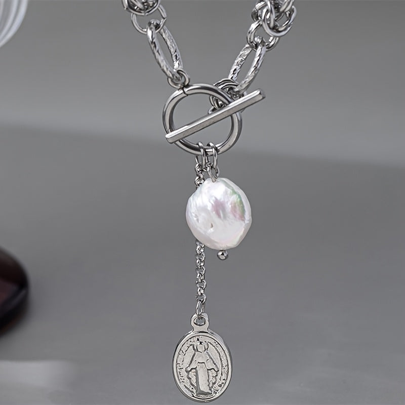 Stainless Steel Necklace with Baroque Pearl Pendant Vintage Style