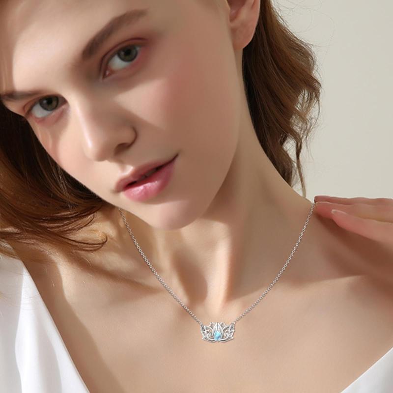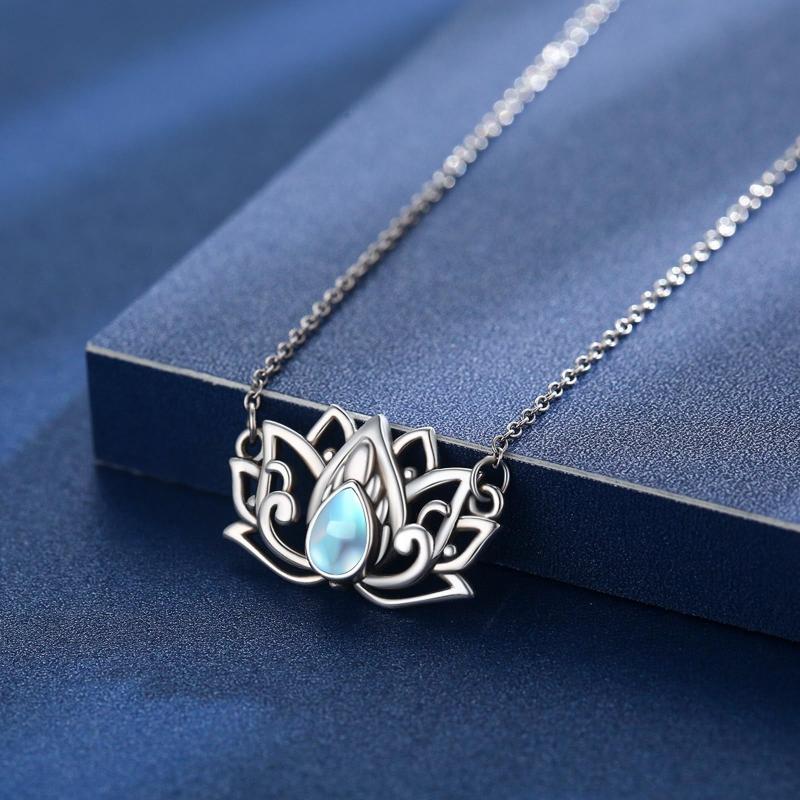 This elegant lotus necklace features a sterling silver lotus pendant with artificial moonstone. Perfect as a gift for women, especially mothers.