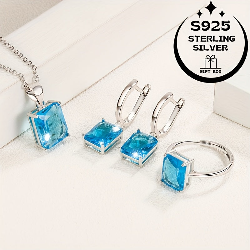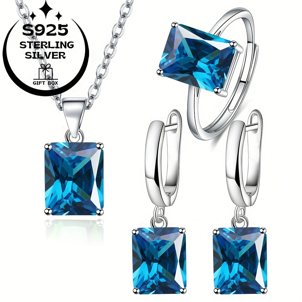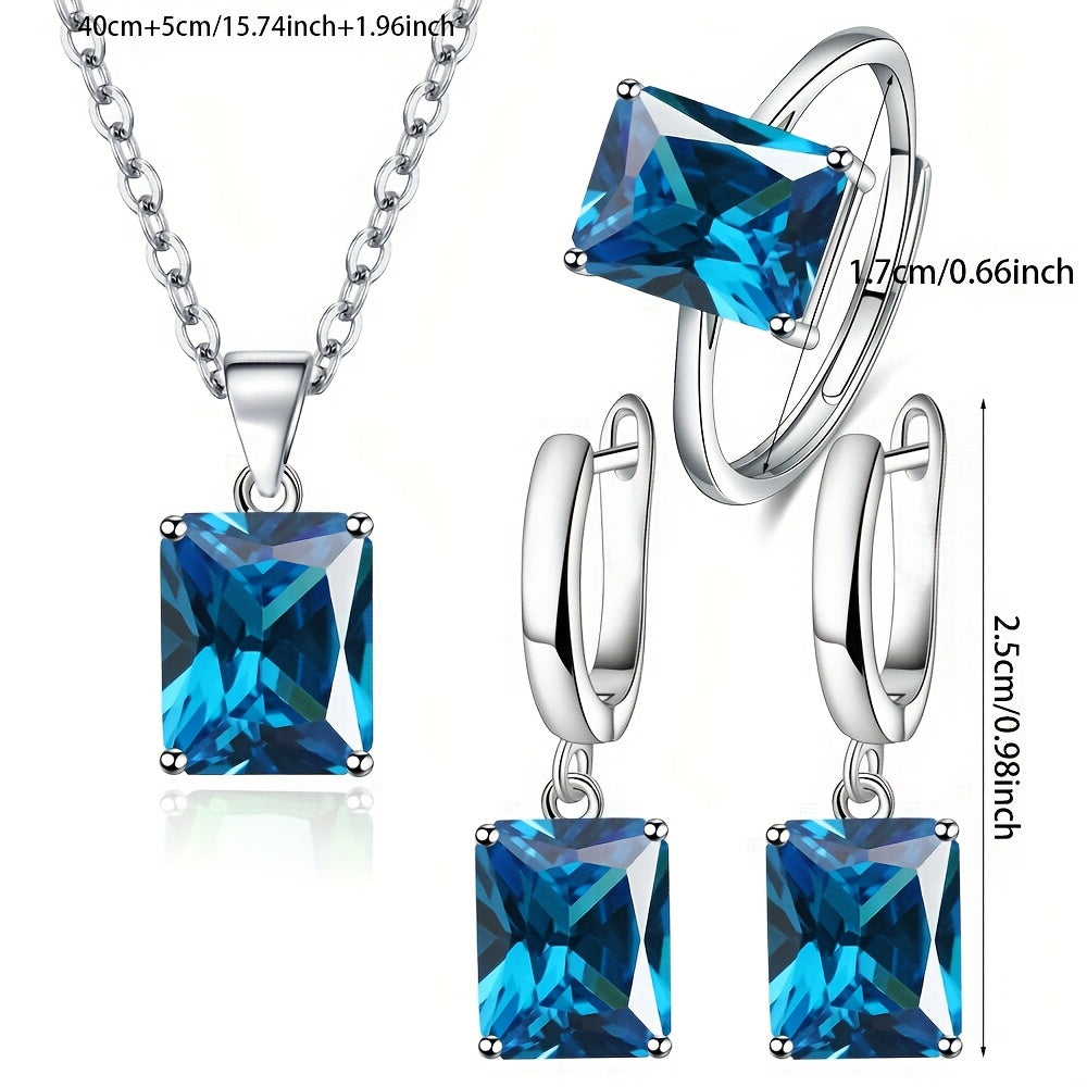 Complete your look with this stunning 4-piece jewelry set in sterling silver featuring square cubic Synthetic Zirconia. Includes pendant necklace, ring, and earrings pair for a stylish touch.