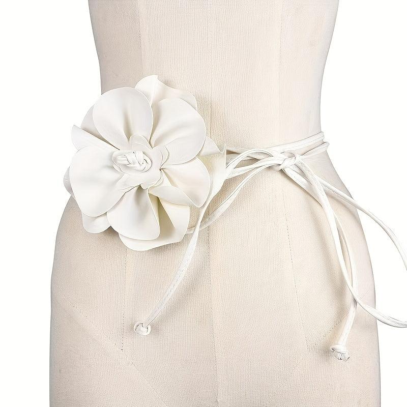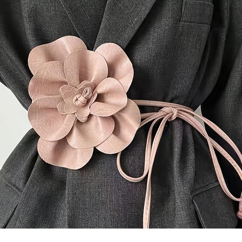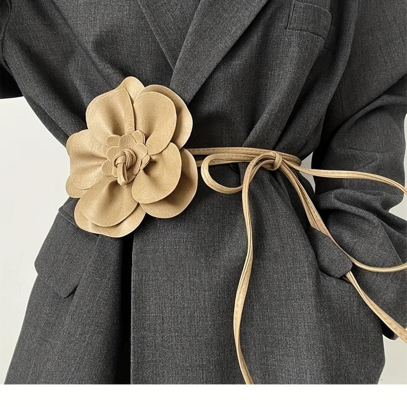 Elevate your look with this chic faux leather dress and coat set featuring a classic camellia decorative waist belt with long ties and a bow adorned with a floral buckle.