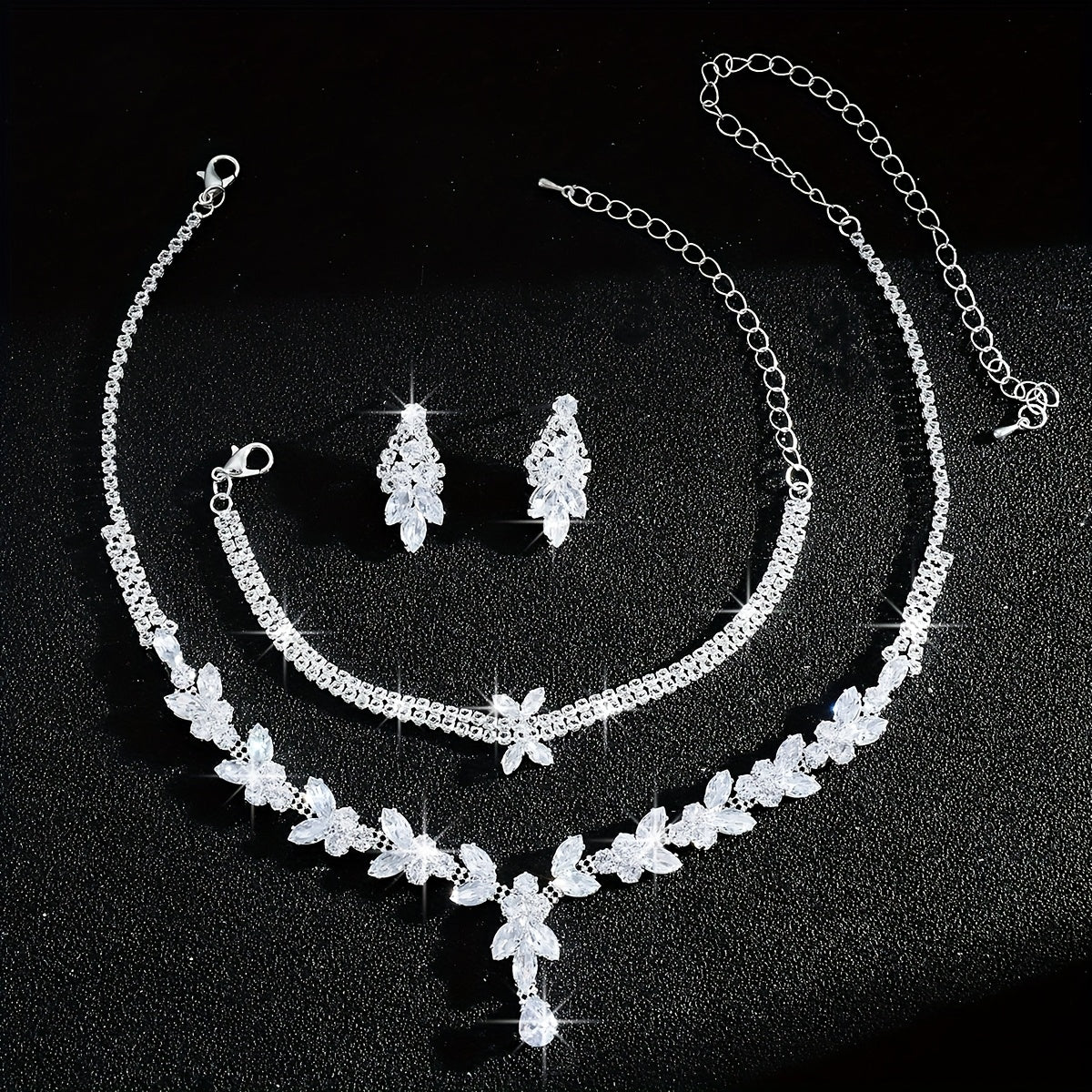Elegant three-piece set including necklace, bracelet, and earrings crafted with high-end synthetic zirconia in a stunning flower design. Perfect for bridal occasions.