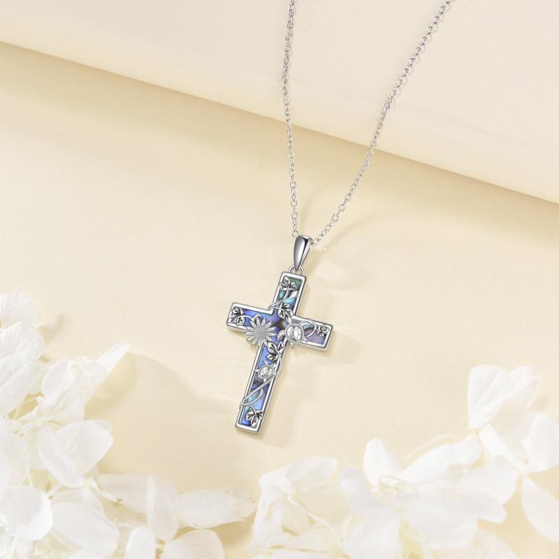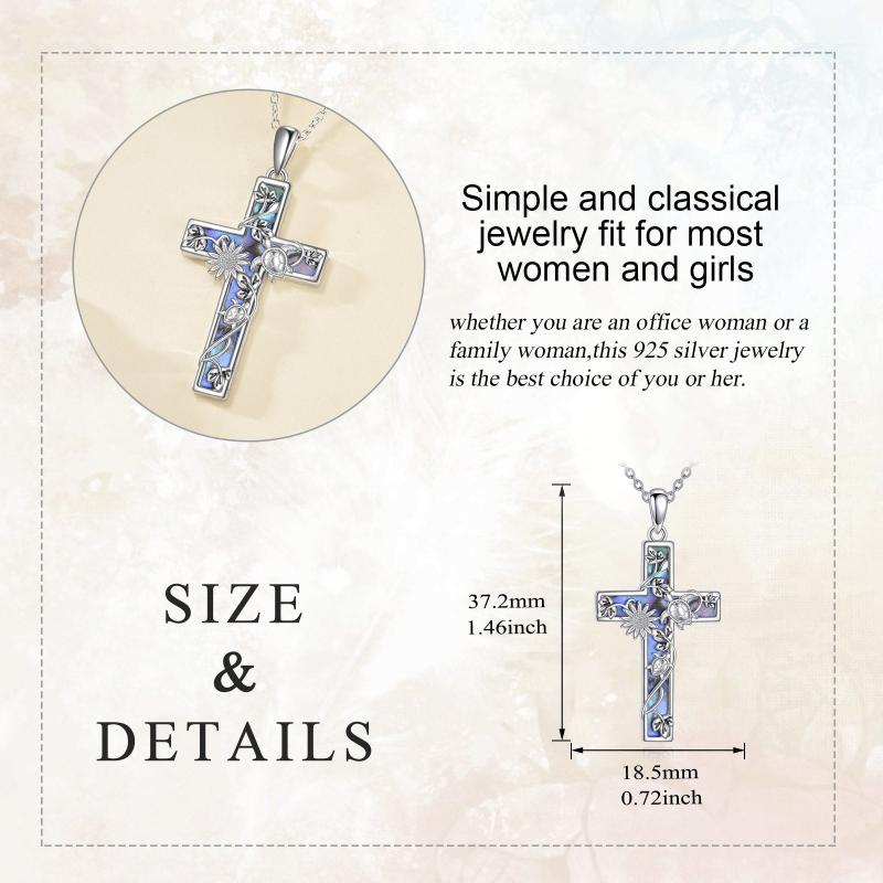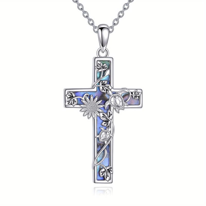 This sterling silver cross necklace features an abalone shell pendant with a turtle design. Perfect religious jewelry for women.