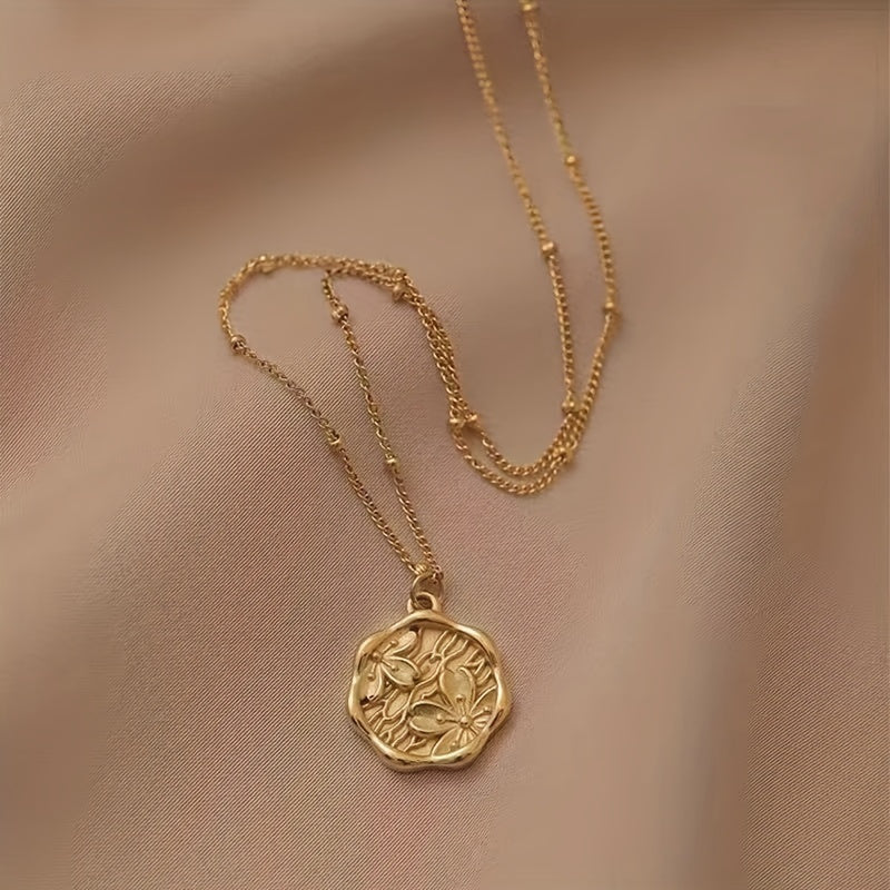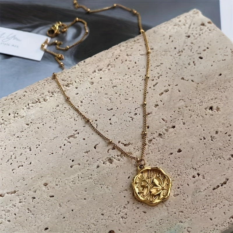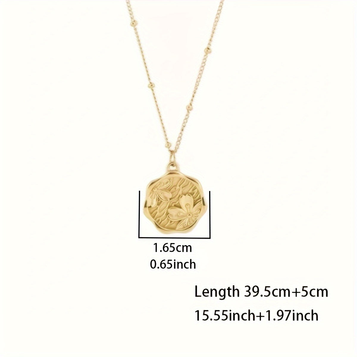 Elegant necklace made of stainless steel with irregular round peach blossom design. Features 18K gold plating for a luxurious look.