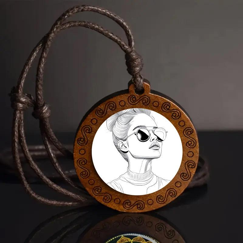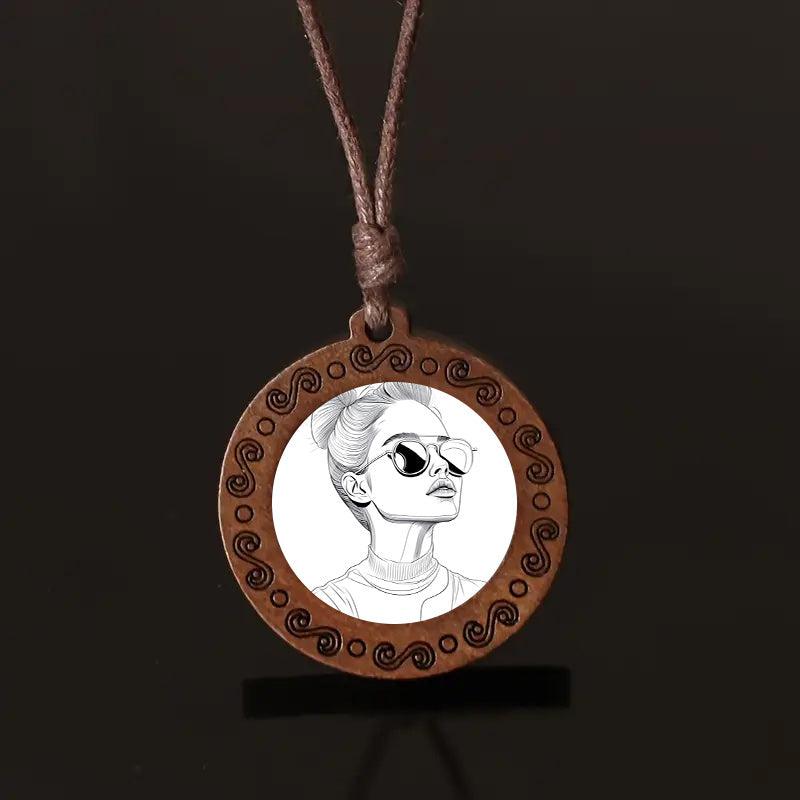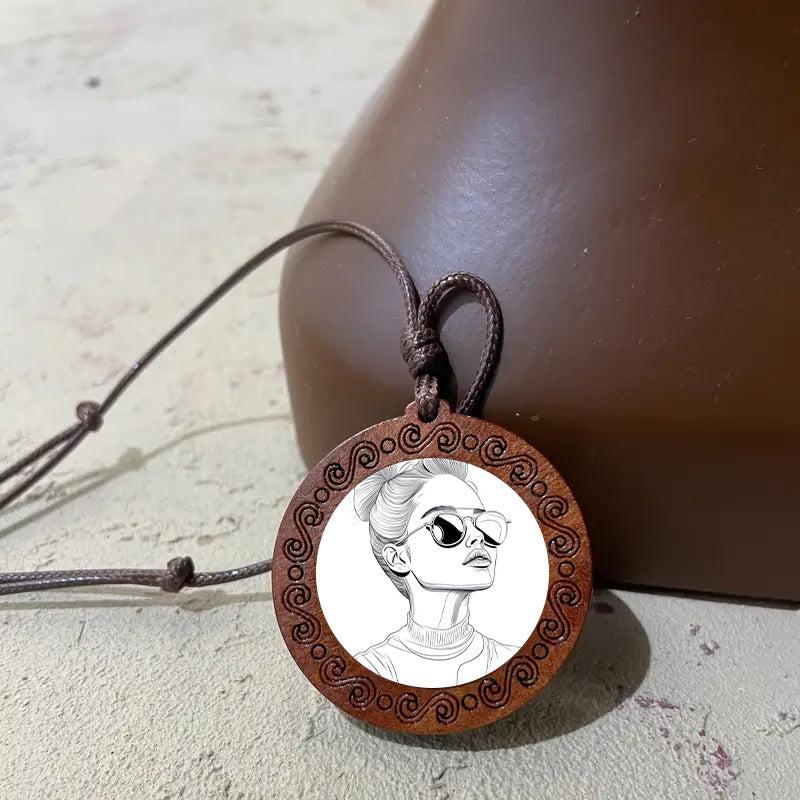 This unique wooden pendant necklace features a hand-drawn woman with glasses, making it a stylish and natural accessory for casual attire. It's a great gift for women who appreciate vintage and bohemian styles.