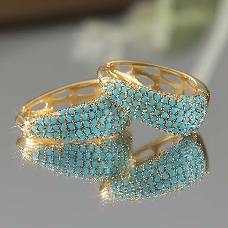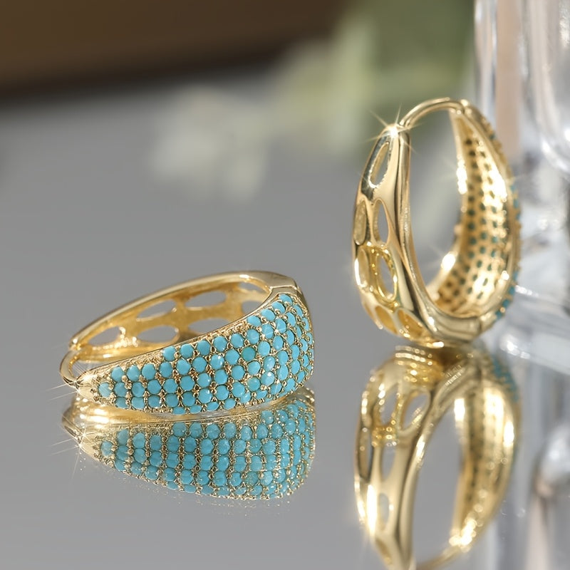 These vintage bohemian copper earrings are hollowed out and carved with synthetic turquoise stones. Golden plated, perfect for daily wear and ideal for Thanksgiving.