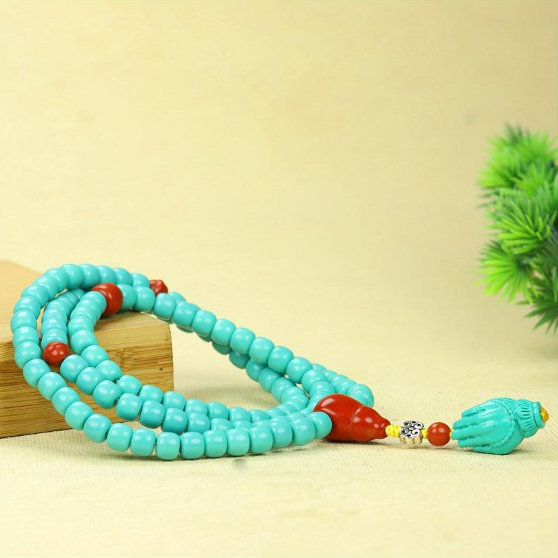 This stunning vintage necklace features green turquoise beads, red accents, and tassels. Perfect for adding a bohemian touch to any outfit.