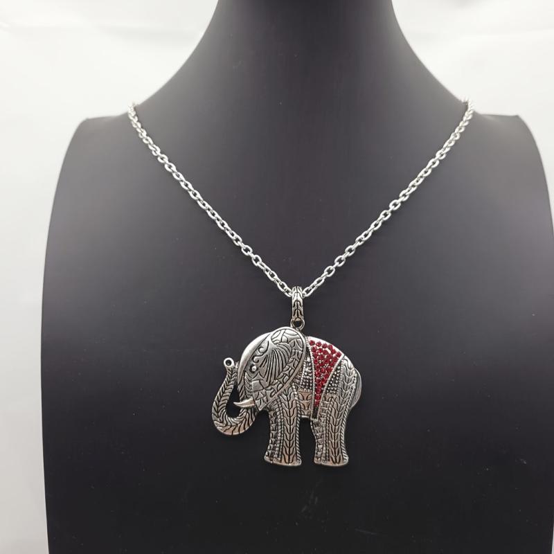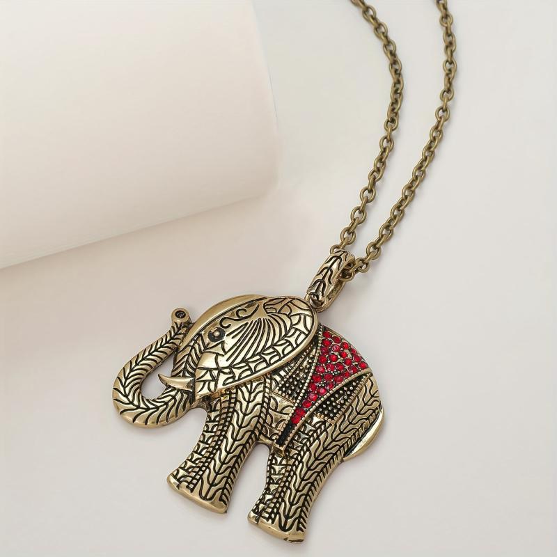 Add a touch of bohemian charm to your outfit with this vintage-style elephant pendant necklace featuring red glass inlay. Perfect for daily wear or holiday celebrations.