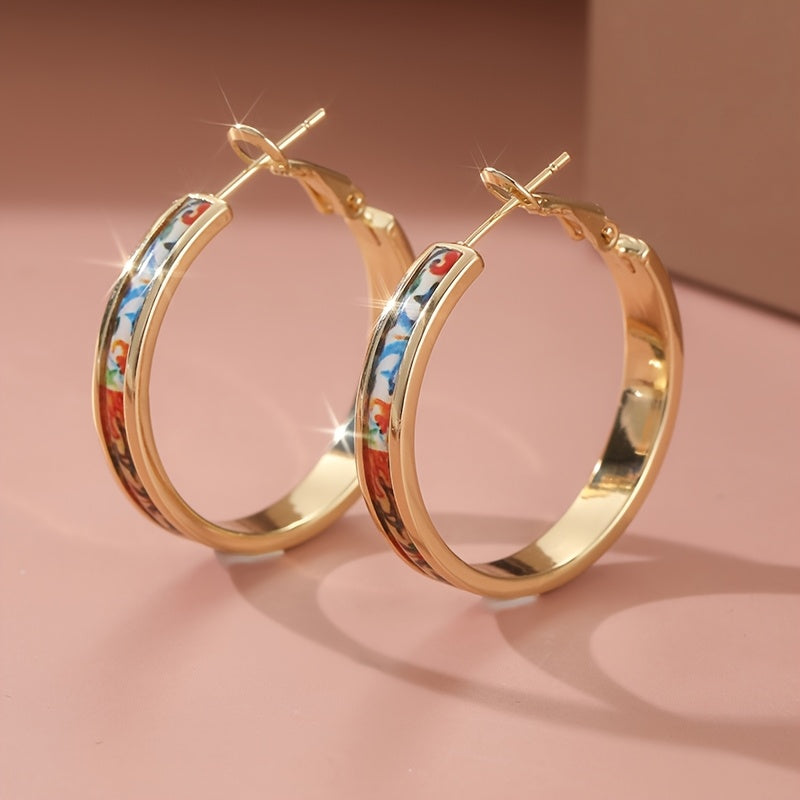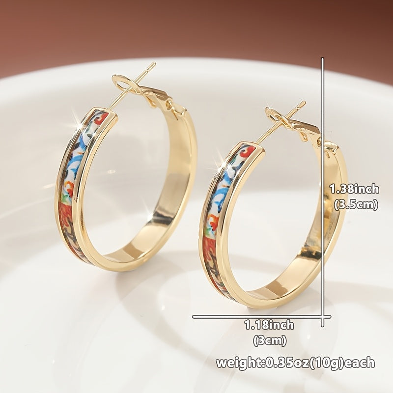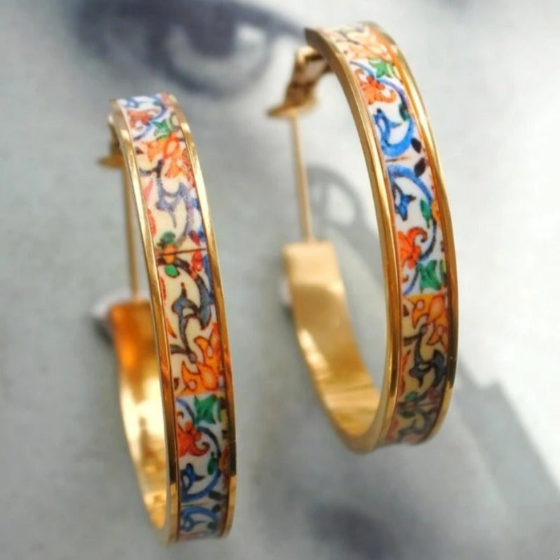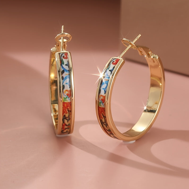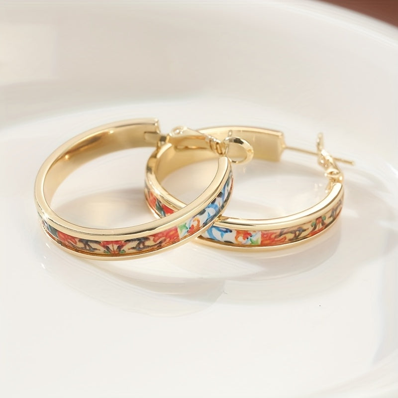 Vintage Boho Hoop Earrings 18K Golden Plated Resin Mosaic Antique Copper Ear Nee