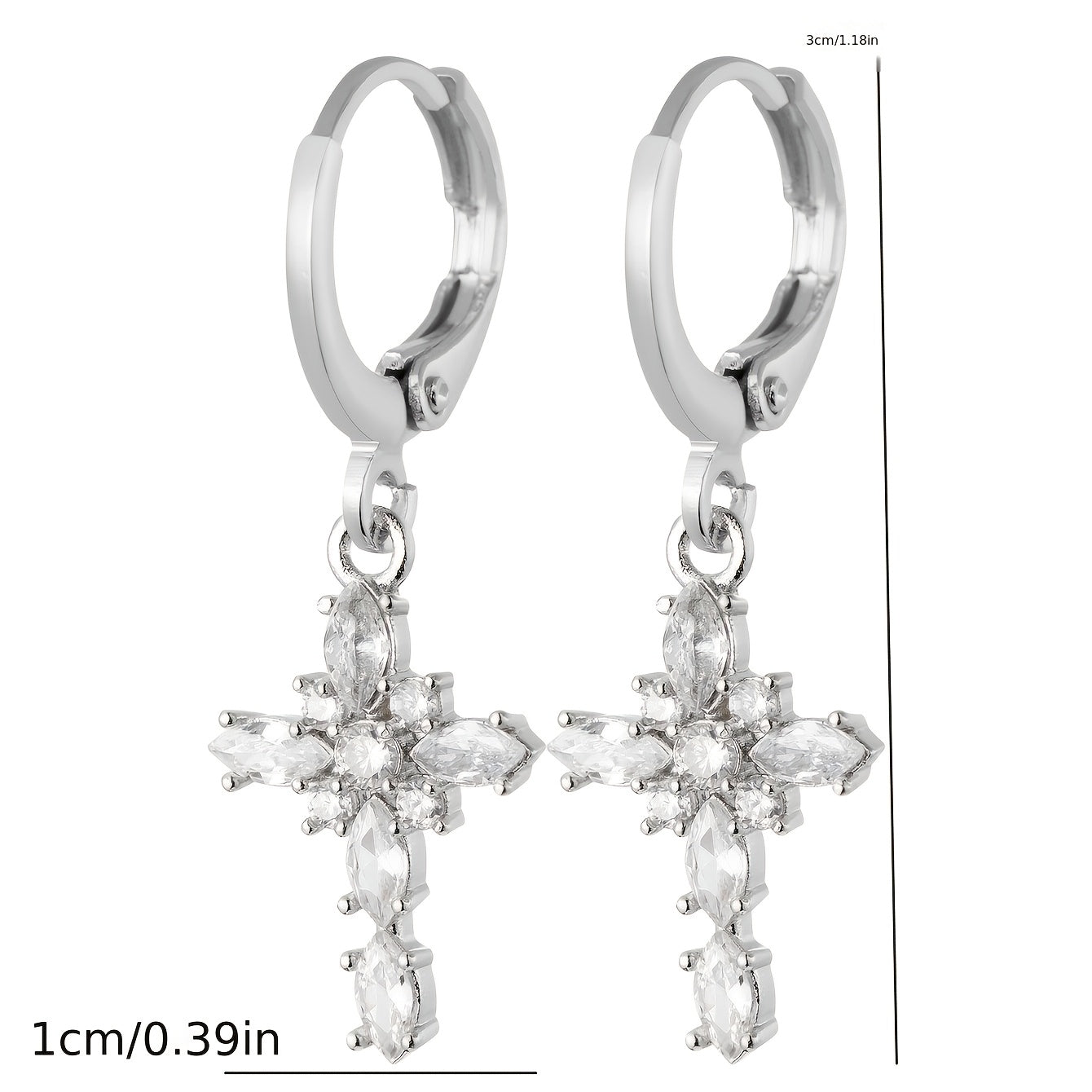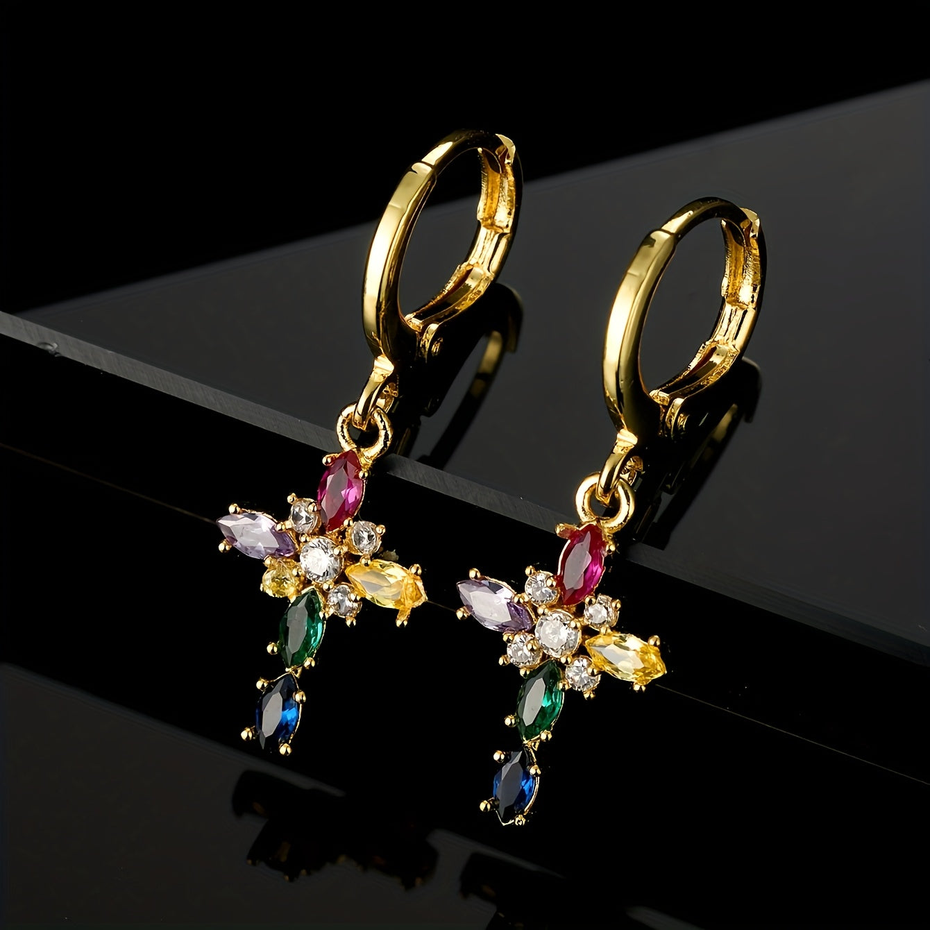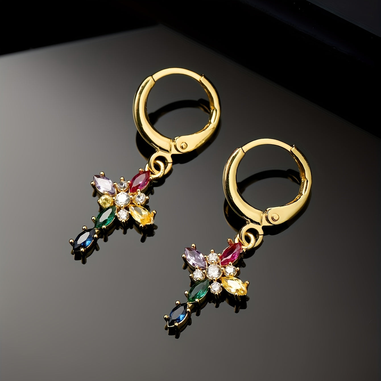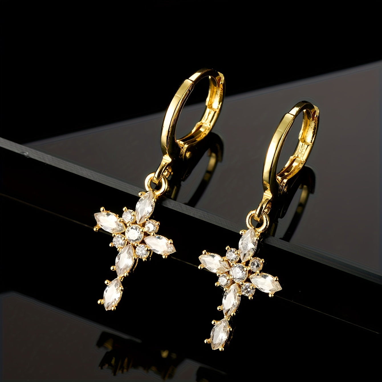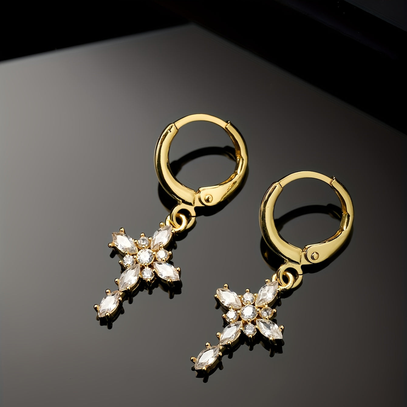 Vintage Boho Style 14K Gold Plated Drop Earrings with Zirconia Cross