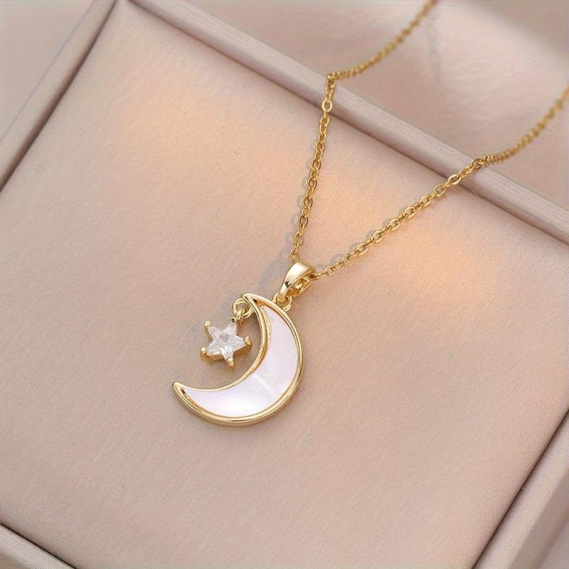 Elevate your style with this vintage vacation style necklace featuring a crescent moon and star pendant adorned with rhinestones. Perfect for women who love unique jewelry.