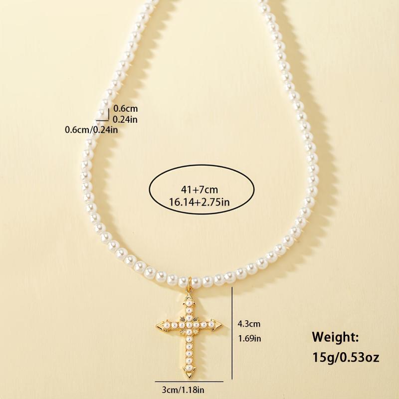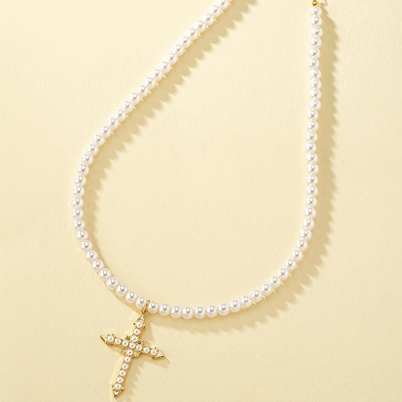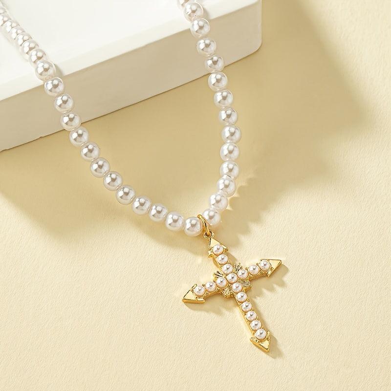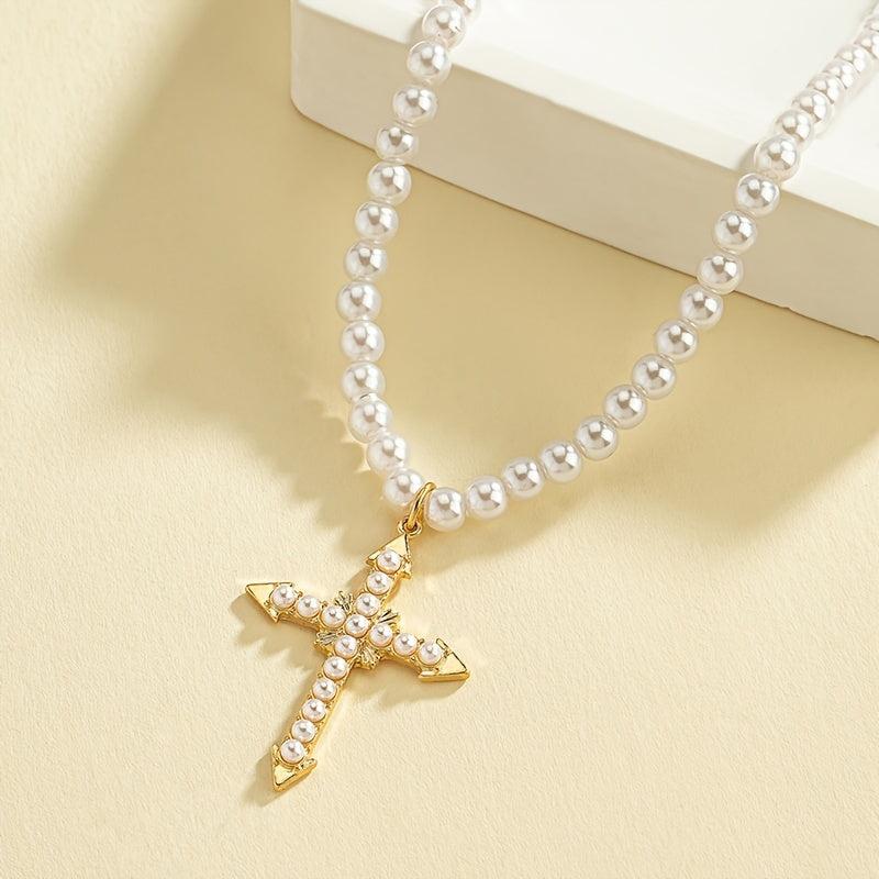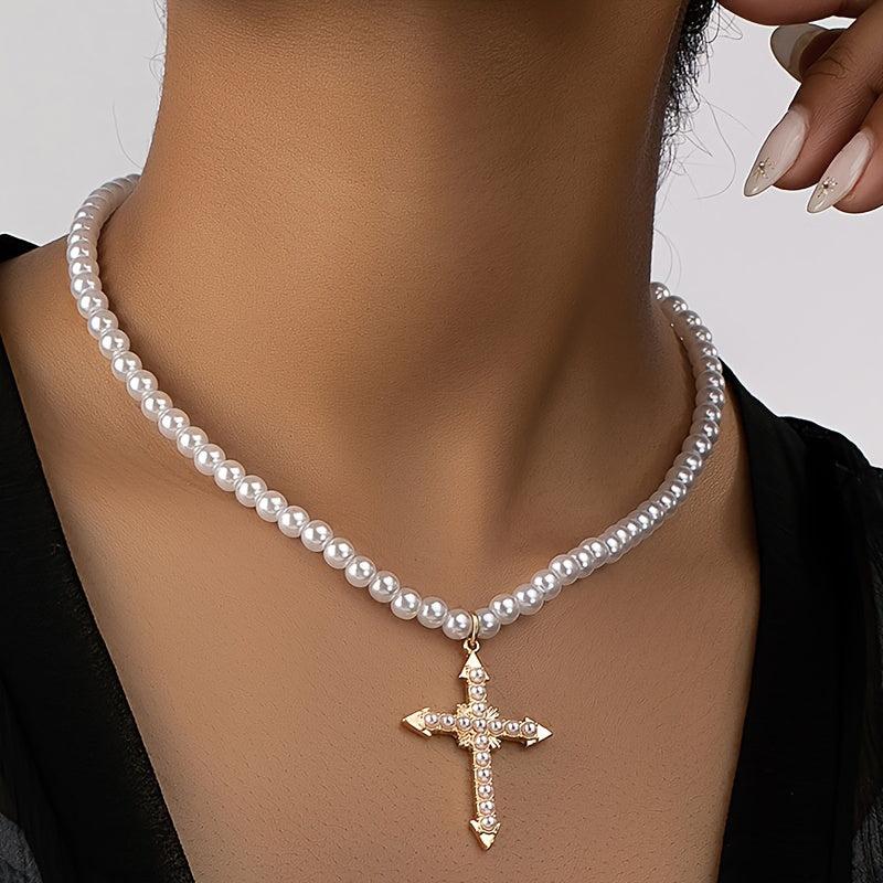 Elevate your look with this faux and golden cross pendant necklace. The vintage-inspired design adds a touch of elegance to any outfit.