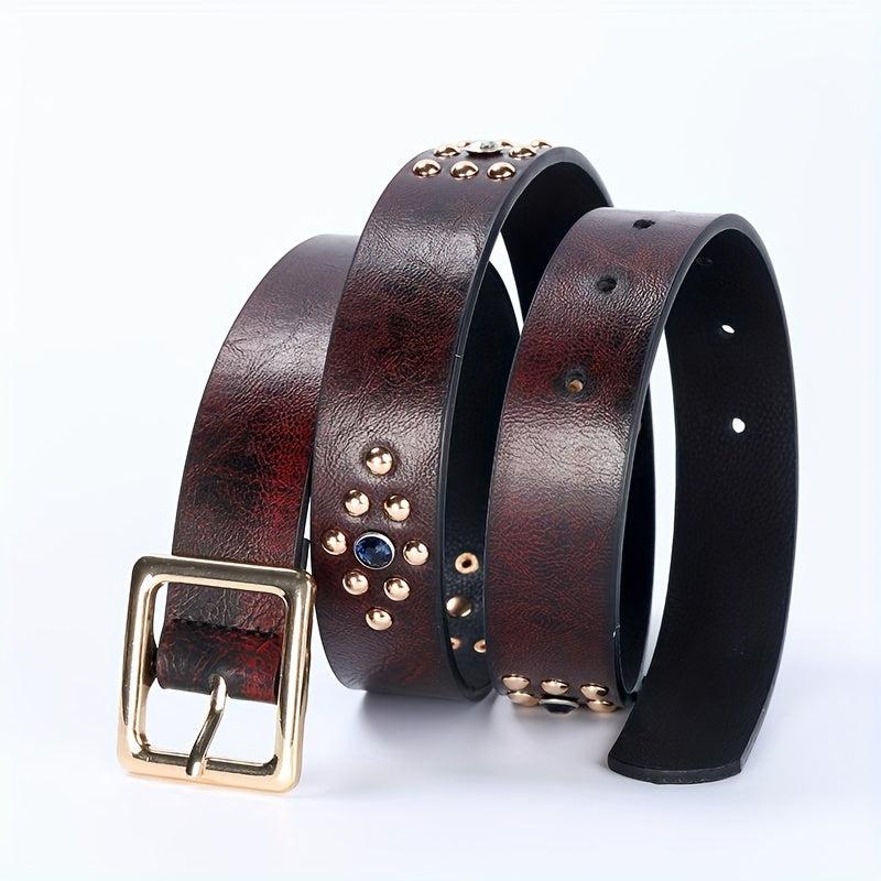 This women's belt features a vintage design with crystal rivets and a pure copper buckle. The distressed finish adds a unique touch to your outfit.