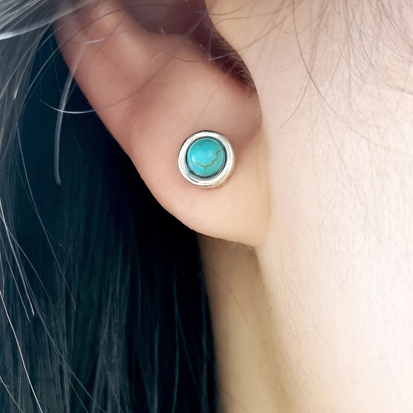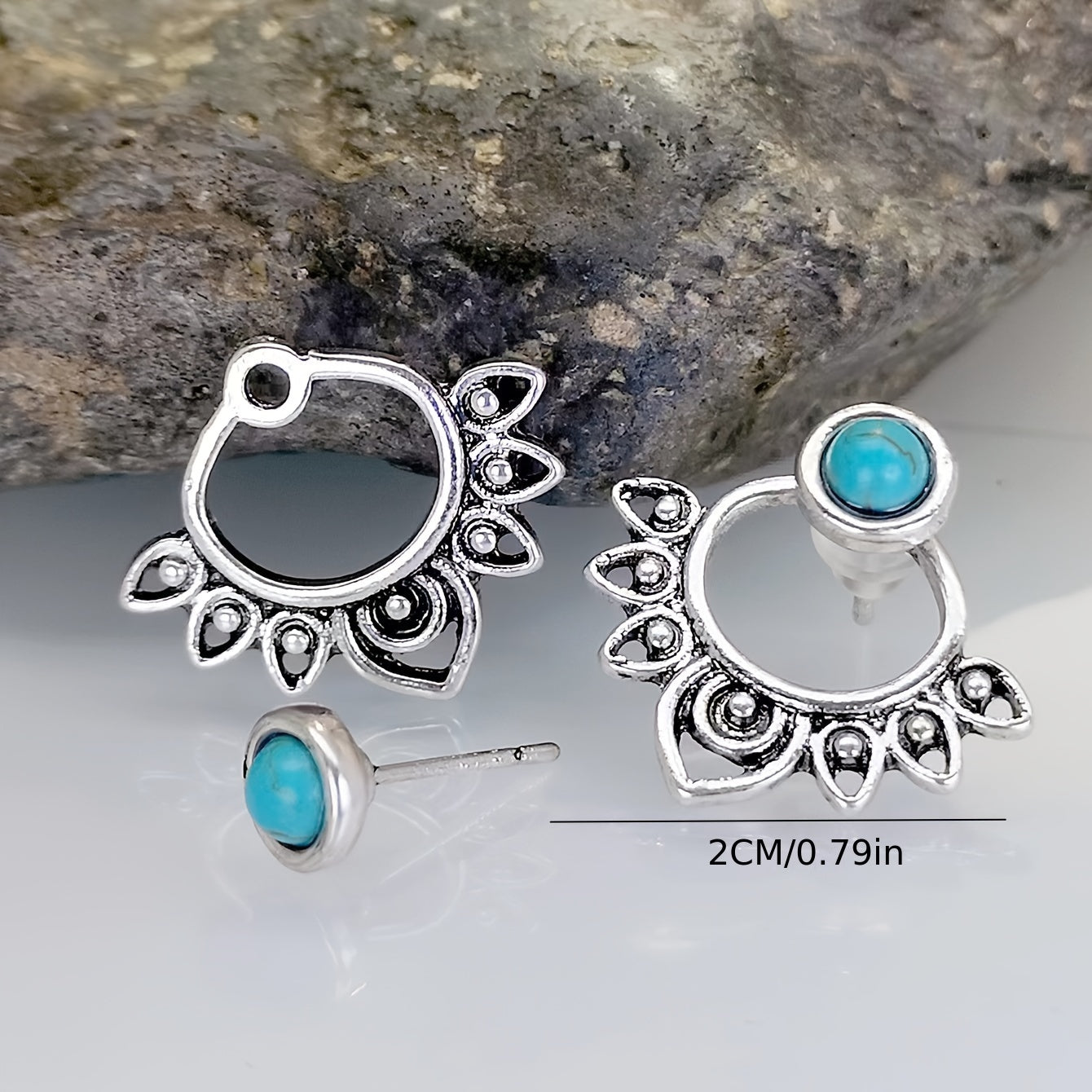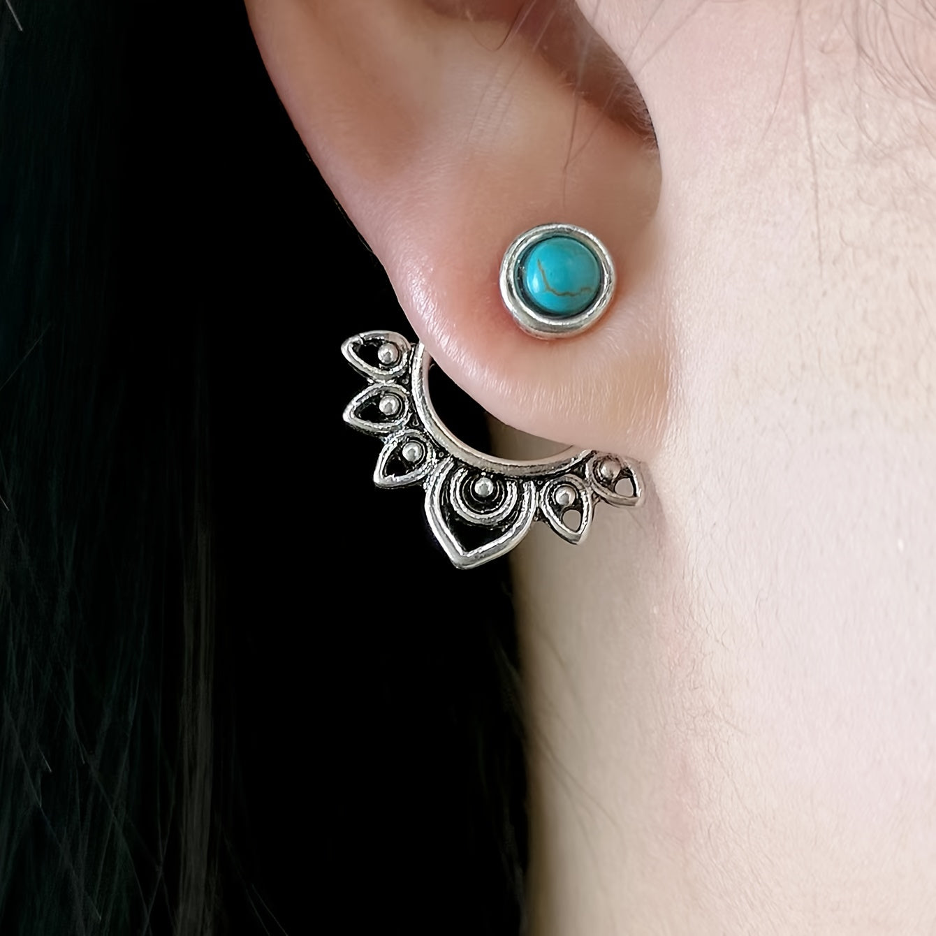 This pair of ear jackets features a vintage flower design with turquoise inlay, adding a retro touch to your look. Made from high-quality alloy, these earrings are ideal for both everyday wear and special occasions. A great souvenir to remember your travels.