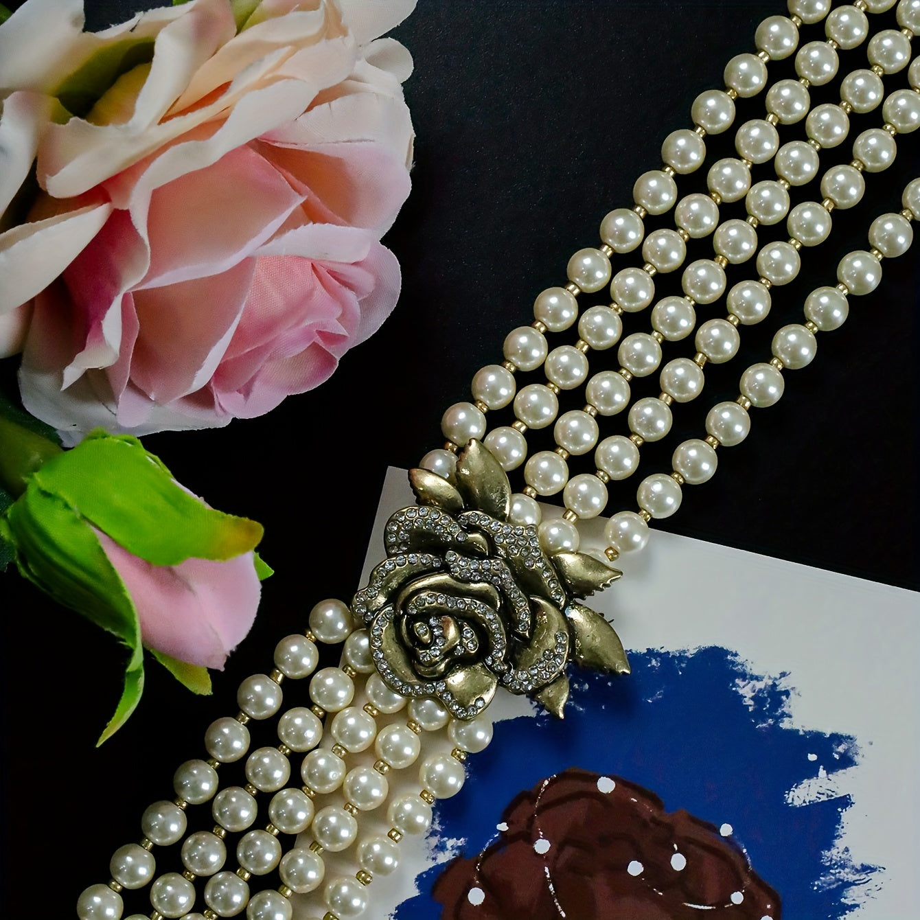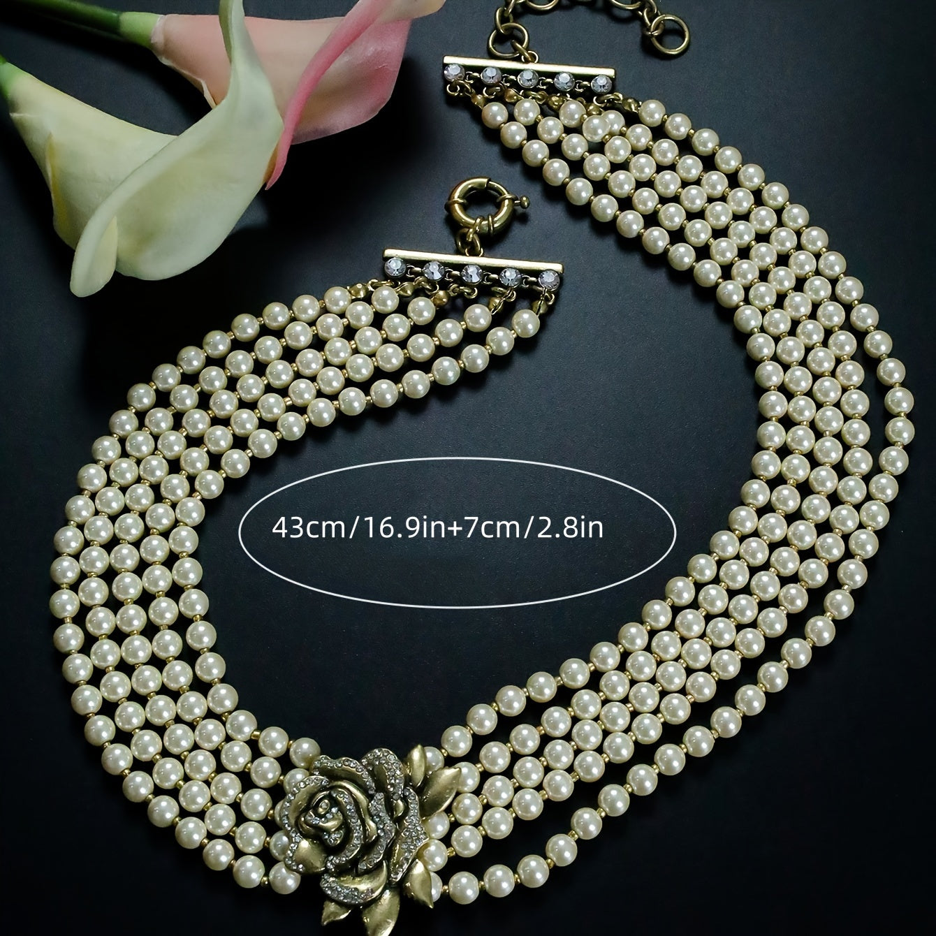 This vintage-inspired necklace features layer glass faux pearls with a 3D rose pendant and rhinestone accents. The adjustable chain makes it perfect for daily wear and special occasions.