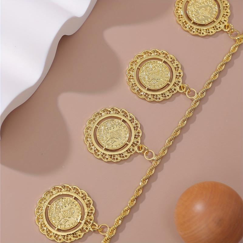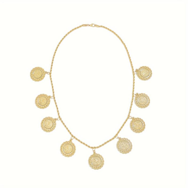 Add a touch of elegance to your holiday banquet wear with this vintage-inspired necklace featuring a round Ottoman coin pendant. Made from golden plated alloy, this necklace is perfect for a Middle Eastern look.