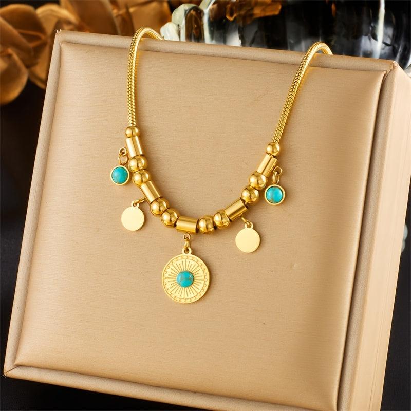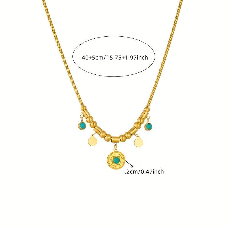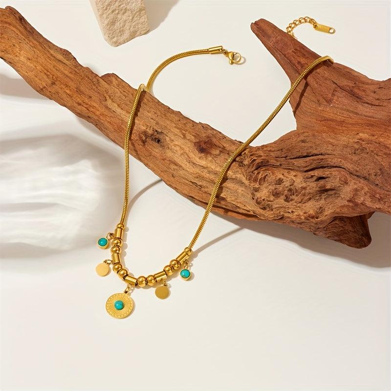 Elevate your casual attire with this unisex stainless steel necklace featuring golden round beads and a striking turquoise stone pendant.