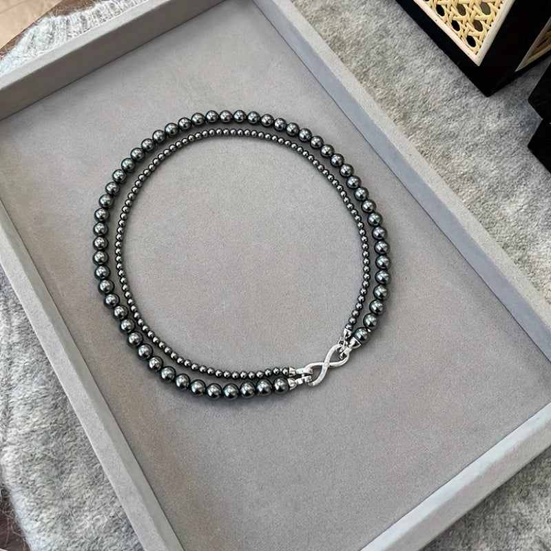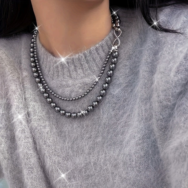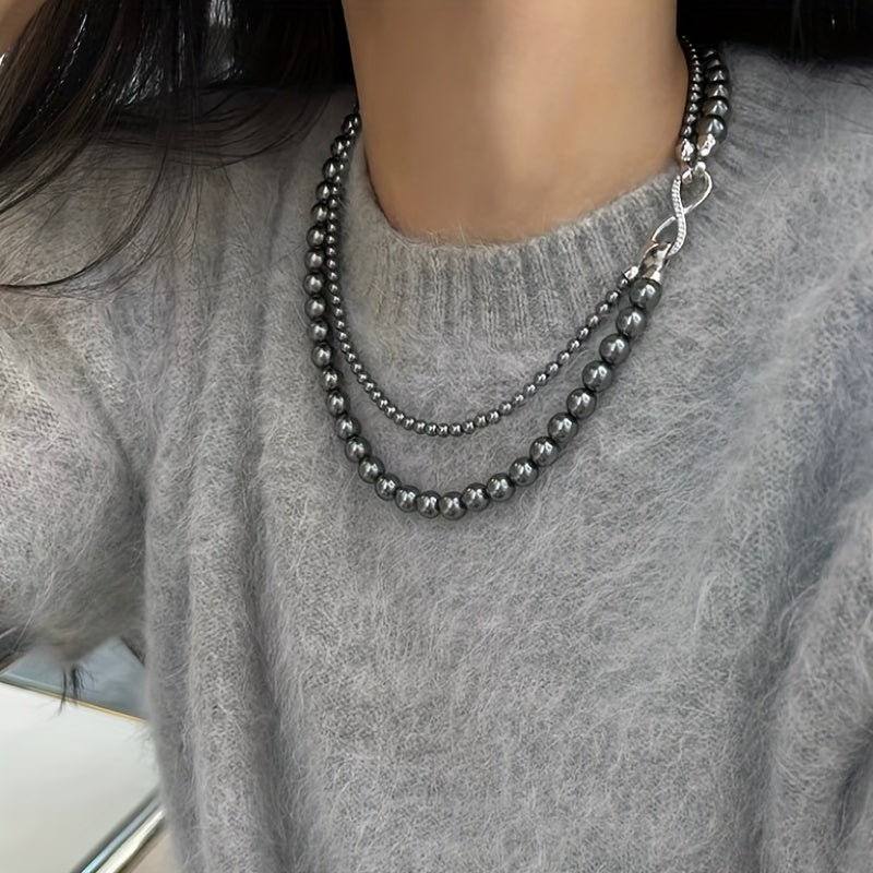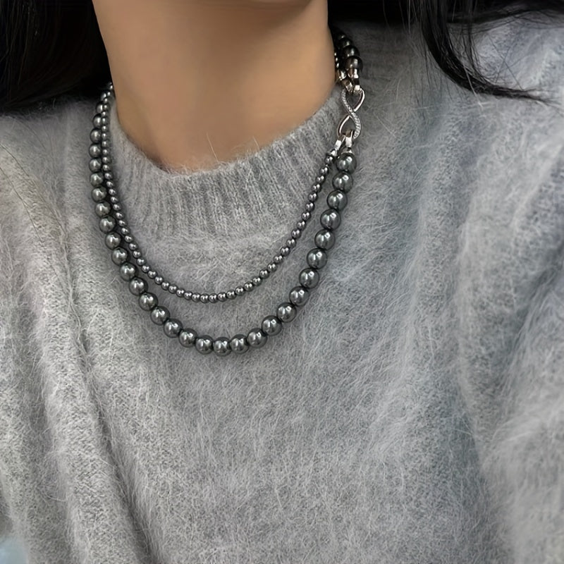 This double strand detachable necklace features synthetic December birthstone beads in muted gray, perfect for parties, music festivals, and everyday layering.