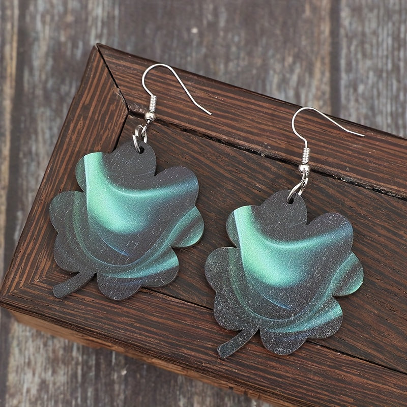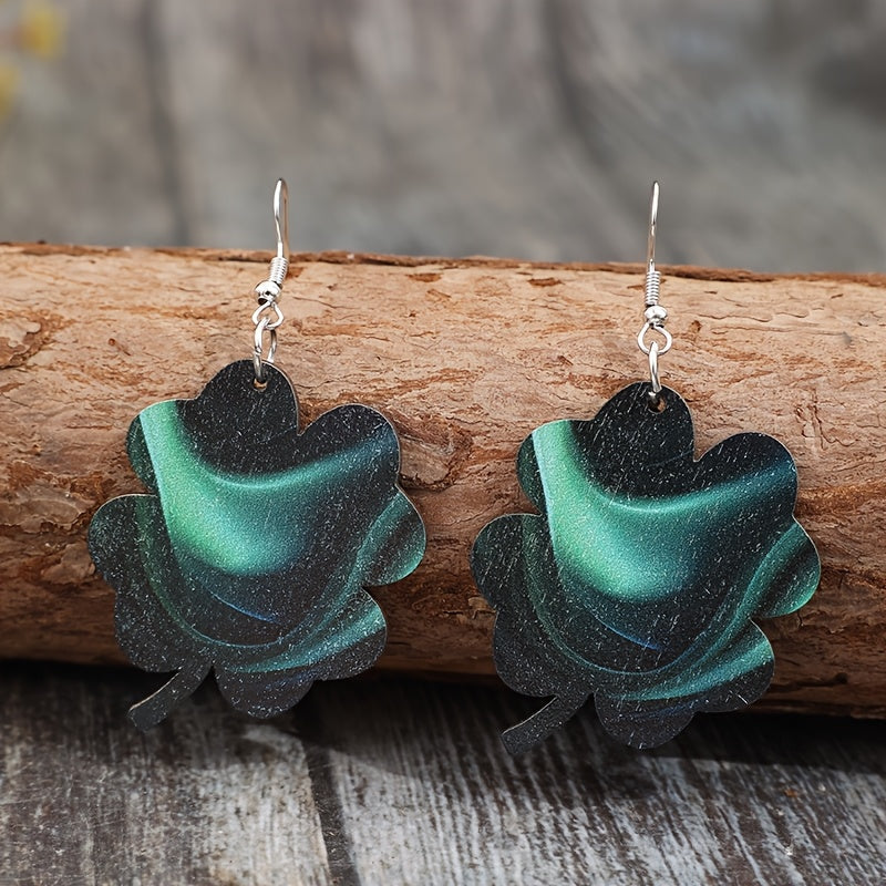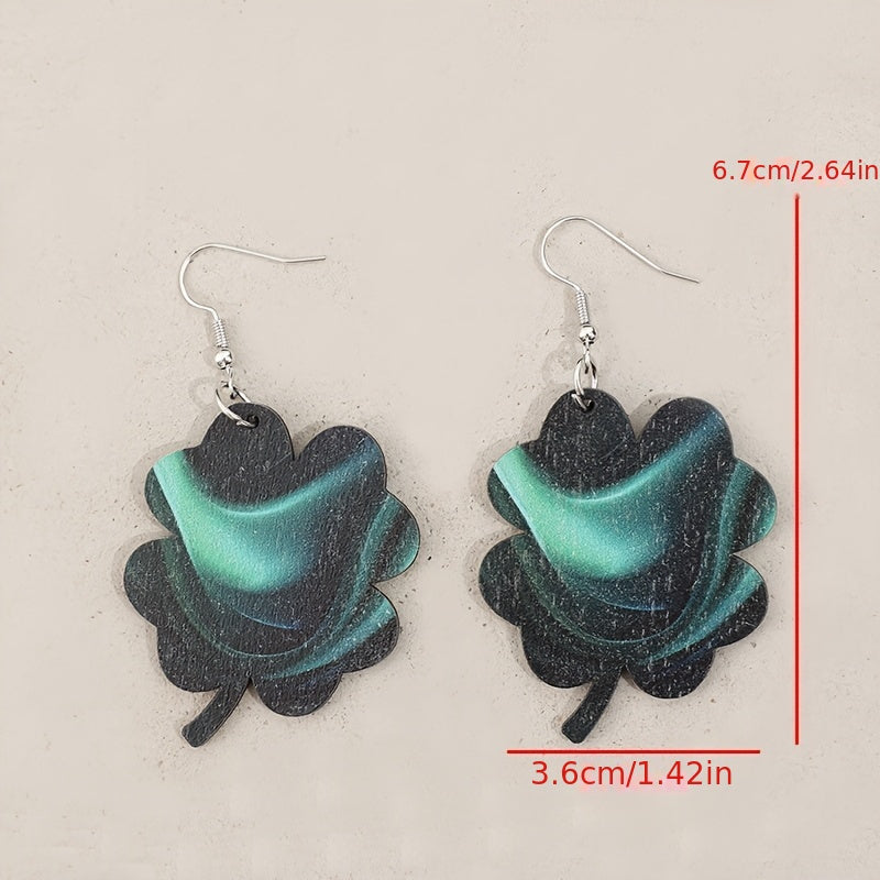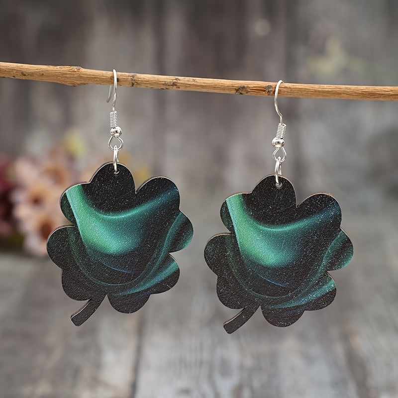Vintage Green Glow Wooden Clover Earrings Retro Style Iron Hooks