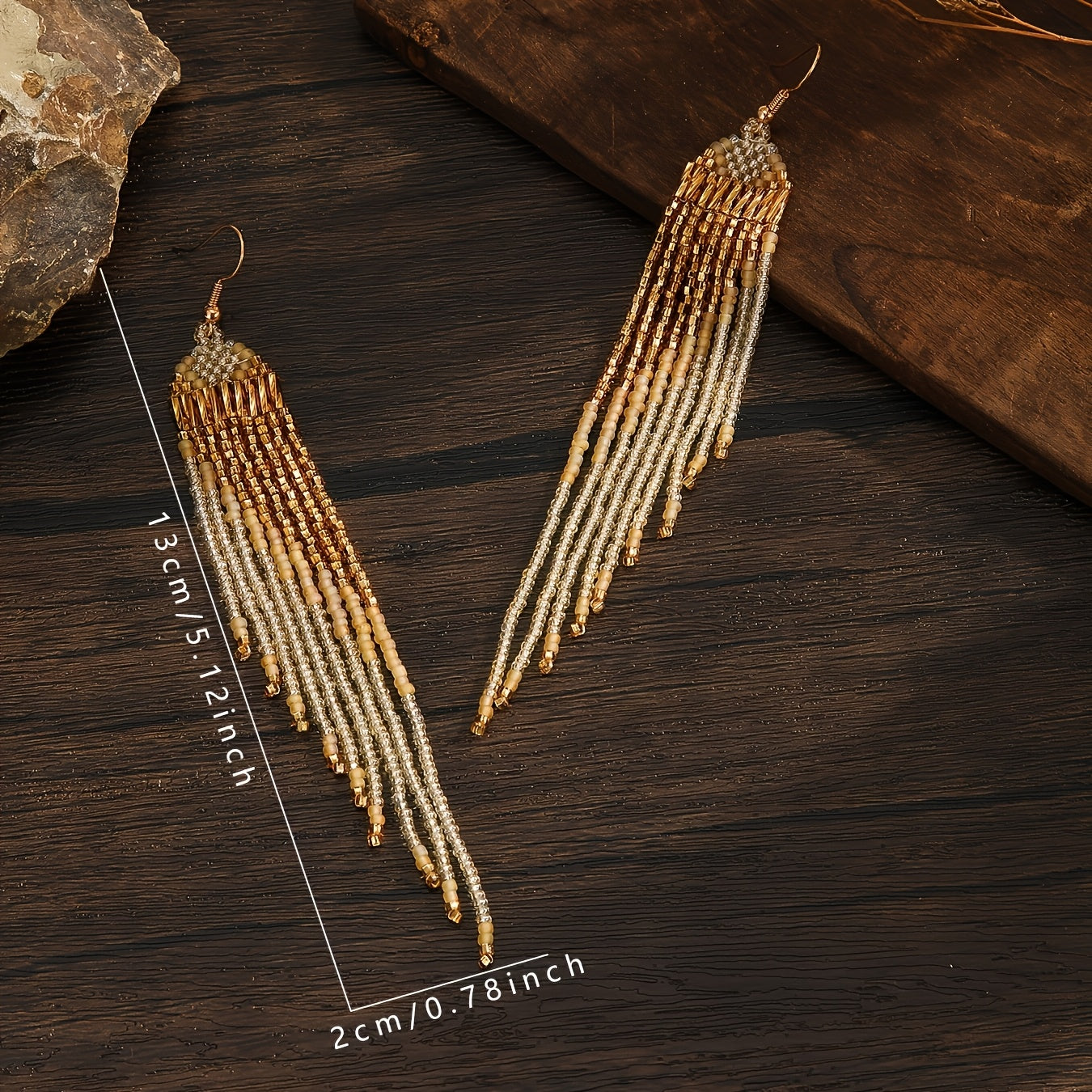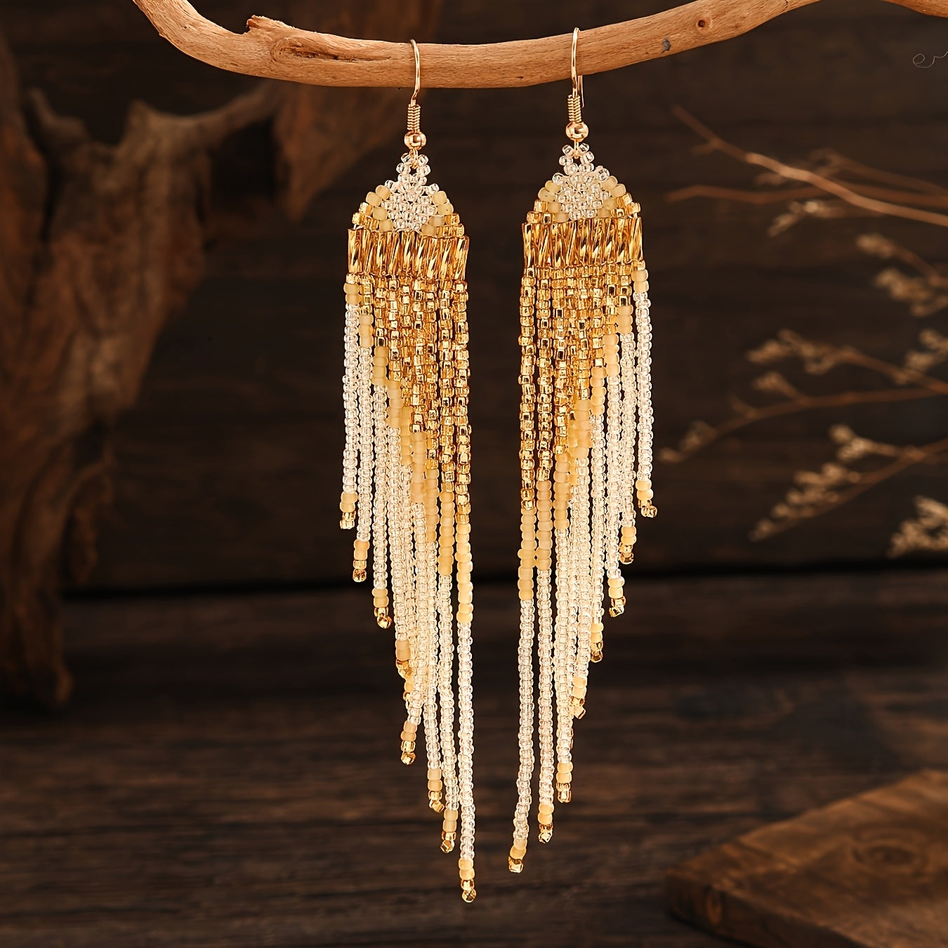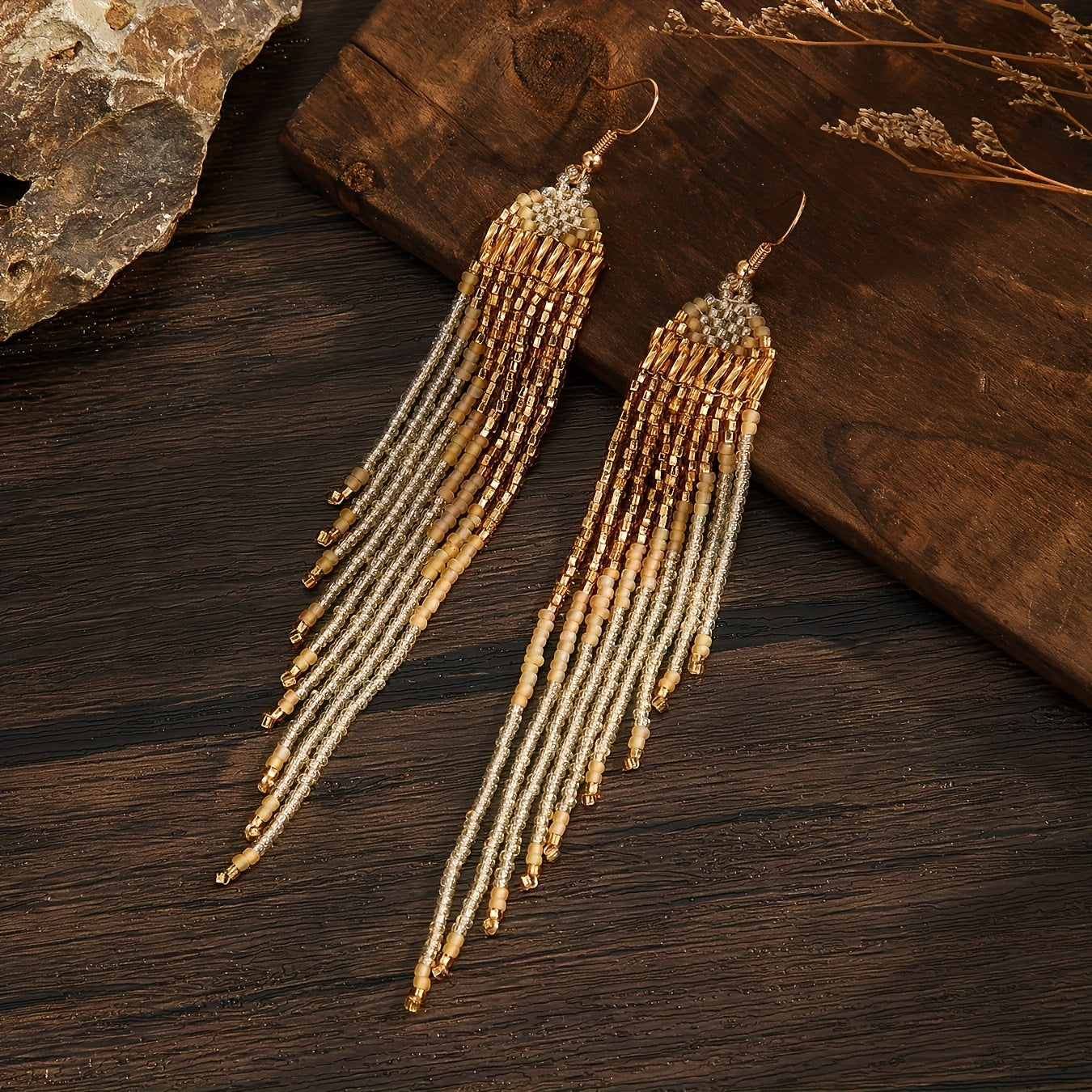 These bohemian beaded tassel earrings feature a heart-shaped design with golden glass seed beads. They are ideal for daily wear or special occasions. Perfect for Mother's Day or as a gift for a loved one.