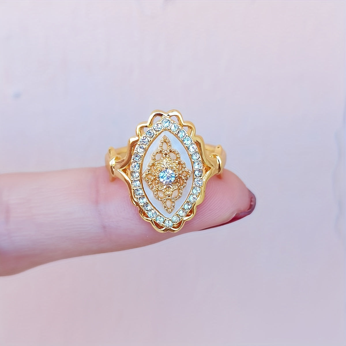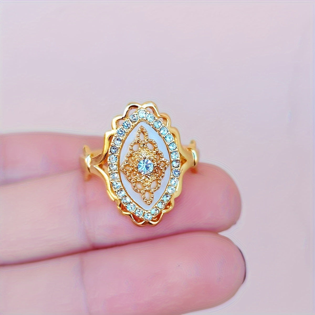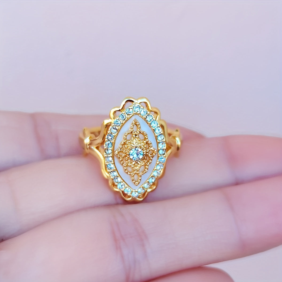 Elegant Middle Eastern-inspired engagement ring featuring intricate lace filigree design and sparkling rhinestone accents.