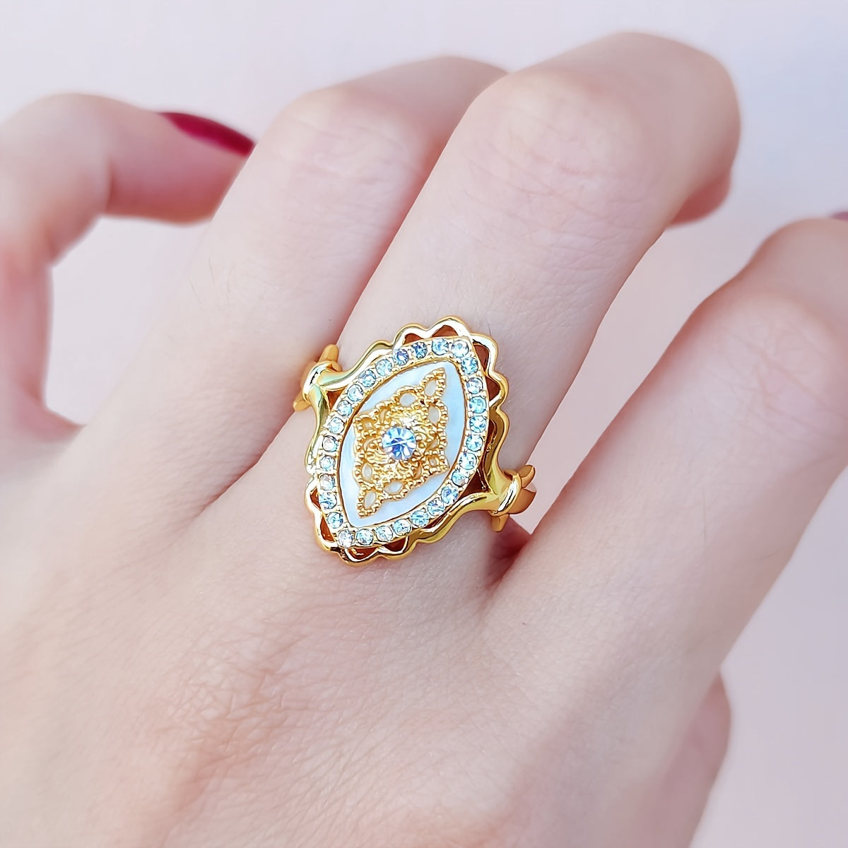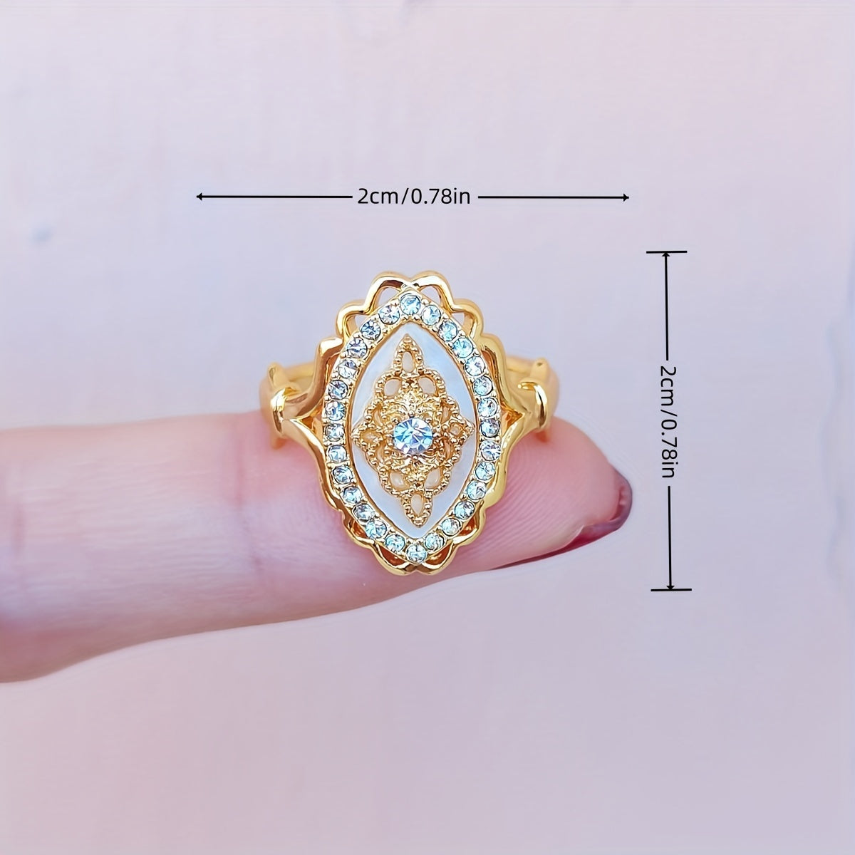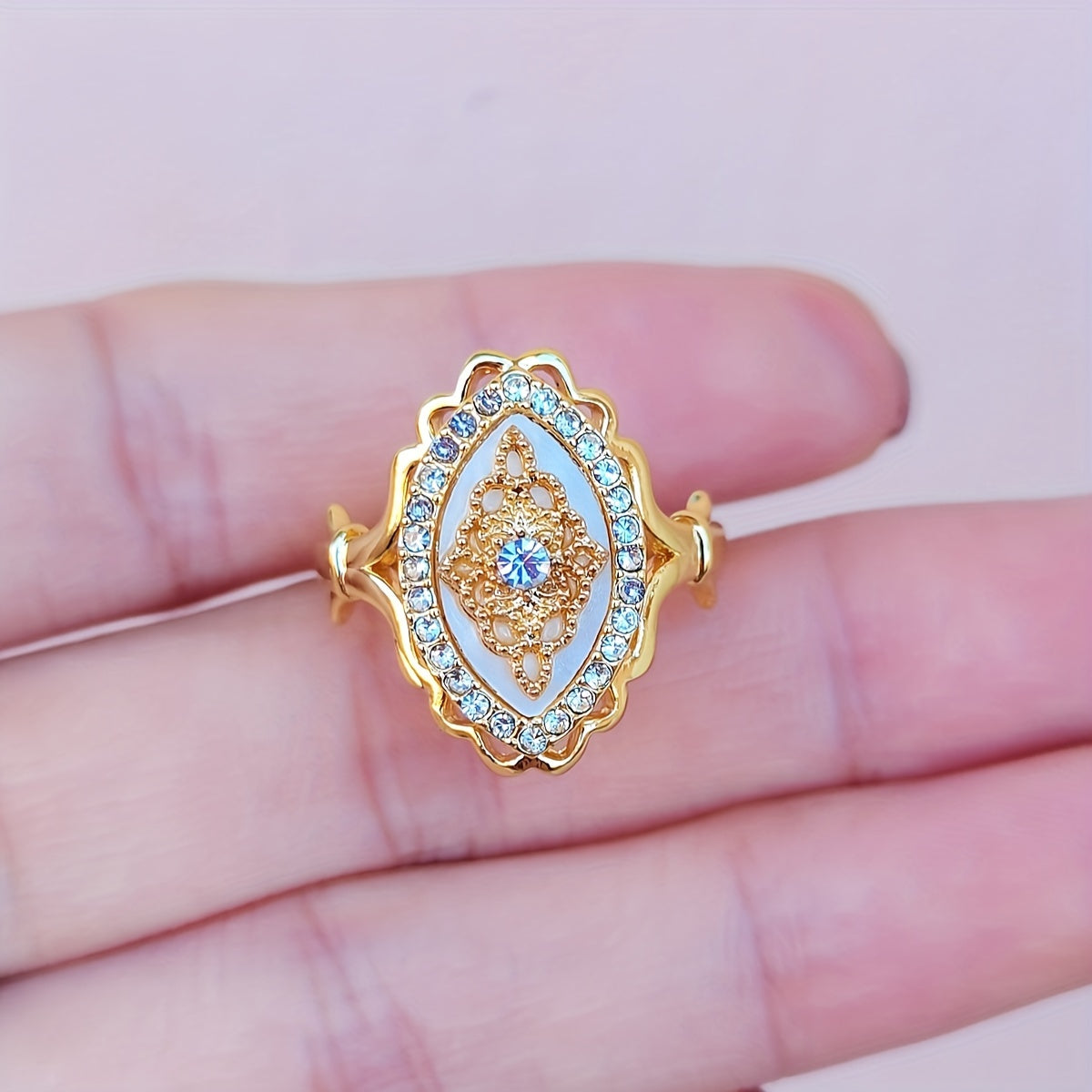 Elegant Middle Eastern-inspired engagement ring featuring intricate lace filigree design and sparkling rhinestone accents.