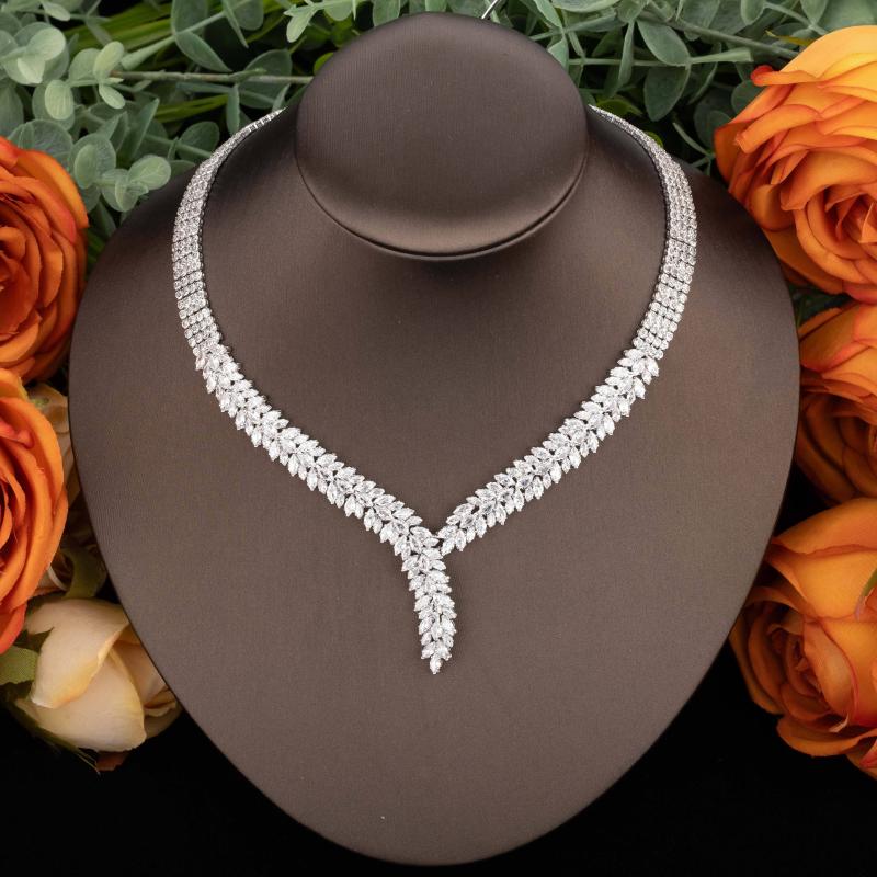 This stunning vintage wedding jewelry set features leaf-shaped cubic zirconia inlay on necklace, earrings, bracelet, and ring in a Middle Eastern style, perfect for weddings.