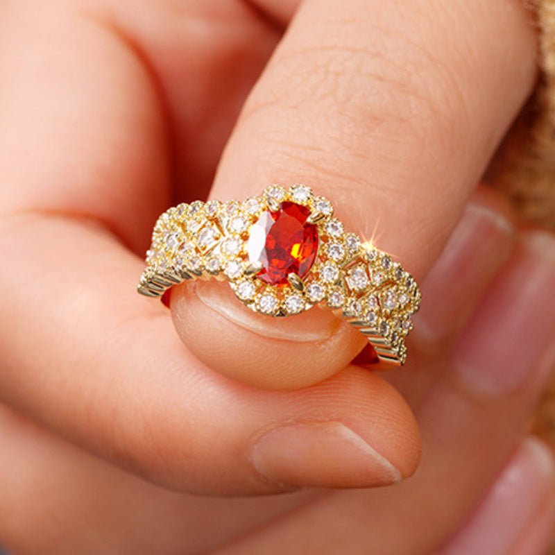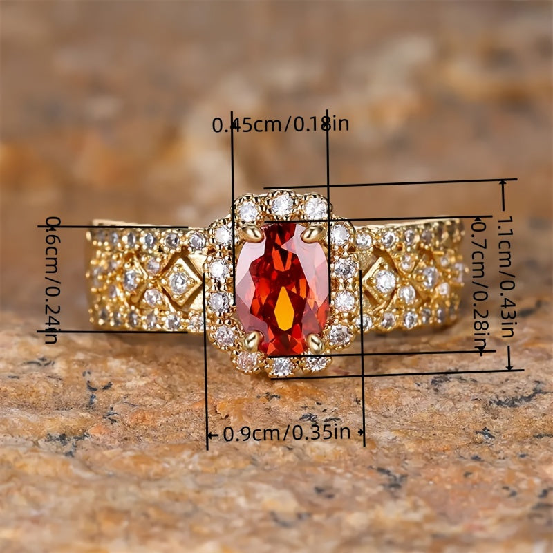 This stunning red zirconia engagement ring features a 4-prong setting with sparkling accents. Perfect for anniversaries, weddings, and casual getaways.