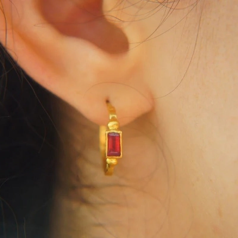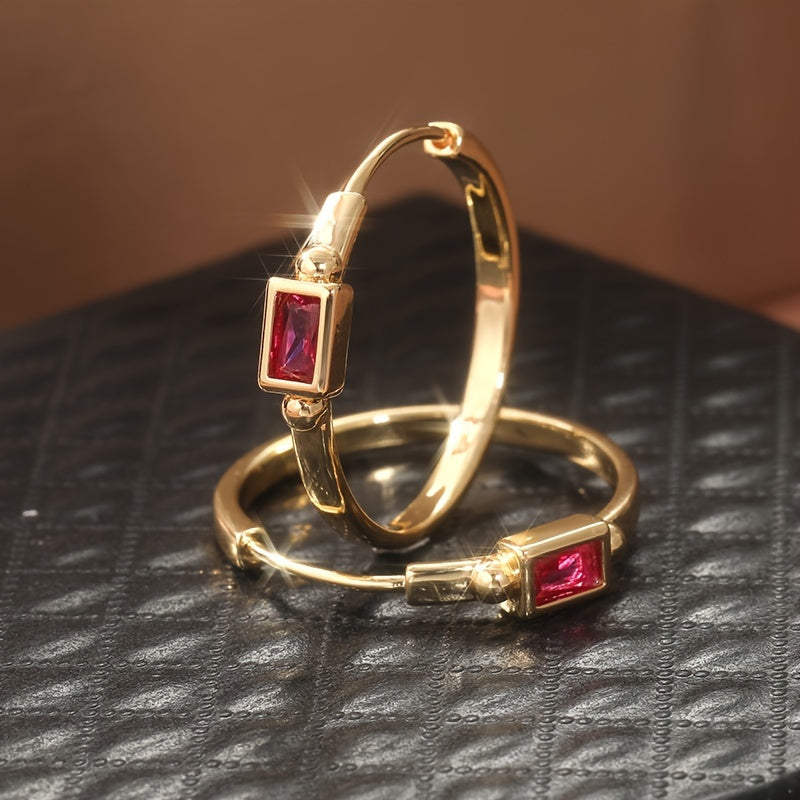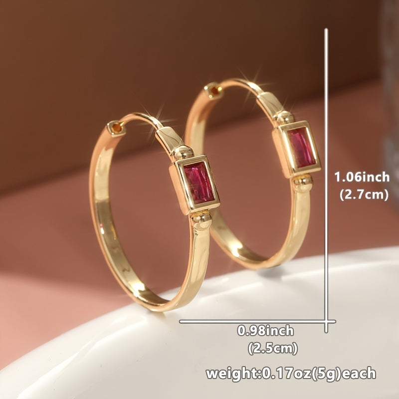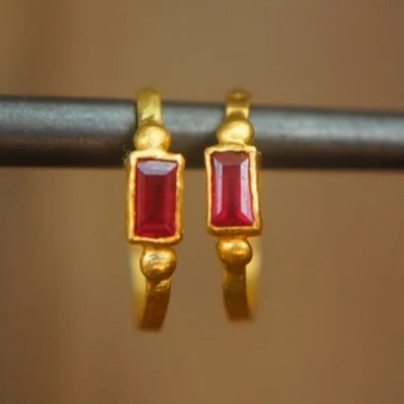 Add a touch of bohemian style to your look with these artisan-crafted hoop earrings. They feature rose red zirconia stones and a golden tone finish, perfect for daily wear or special occasions.