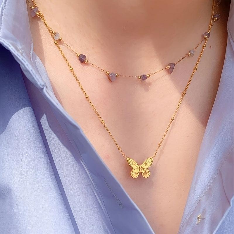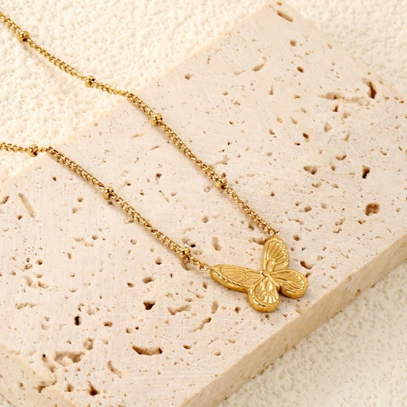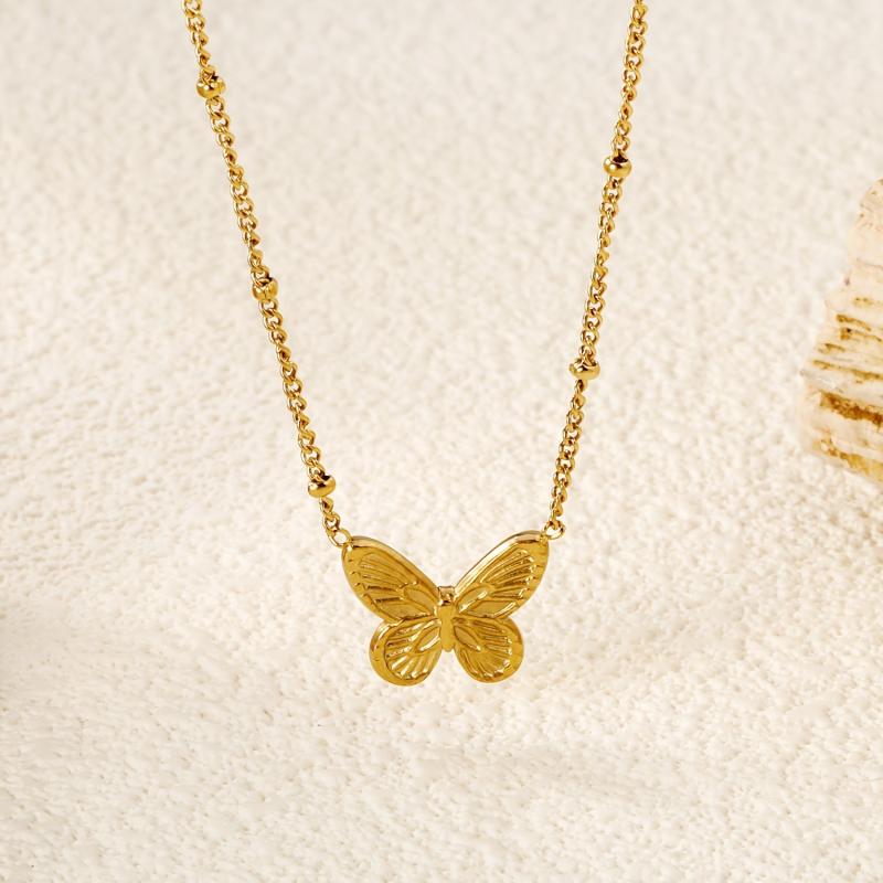 This stainless steel butterfly pendant necklace features a beaded chain for a vintage-inspired look. It's perfect for daily wear or gifting, suitable for both men and women.