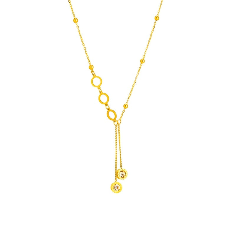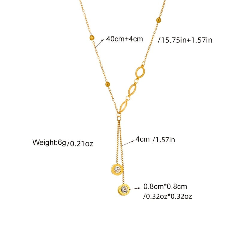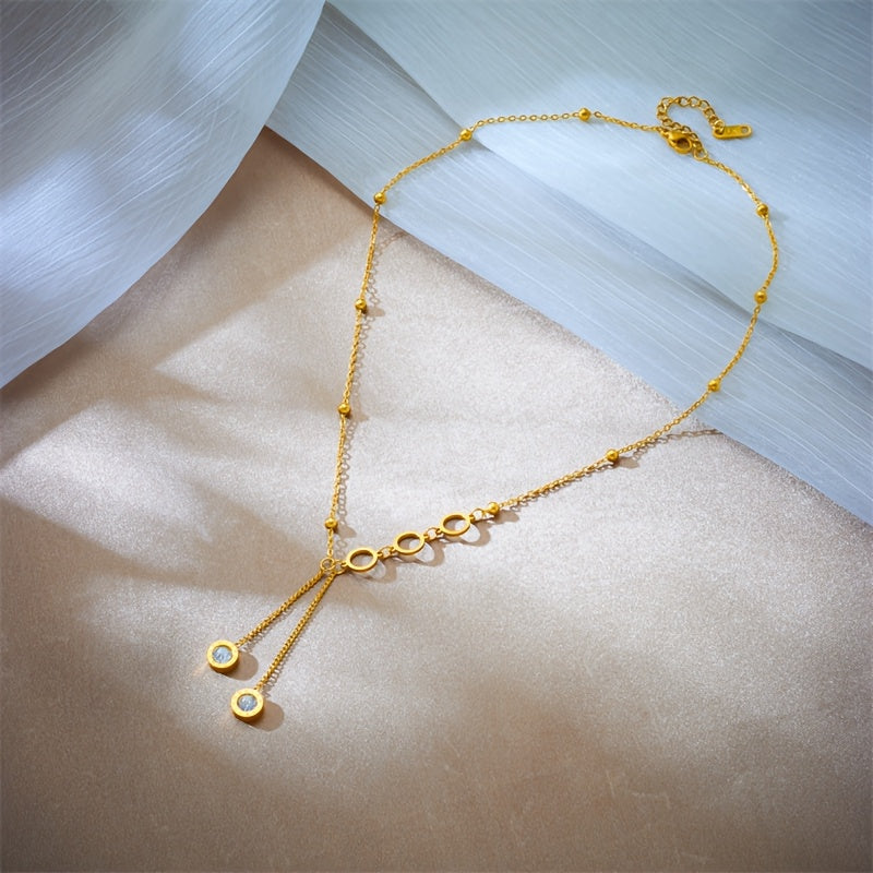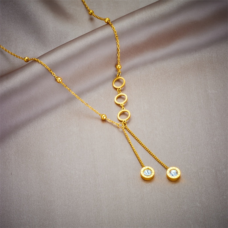 Elegant stainless steel necklace featuring synthetic zirconia pendants and a long tassel circle design. Perfect accessory for daily wear or special occasions.