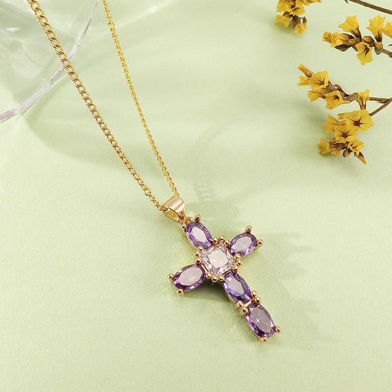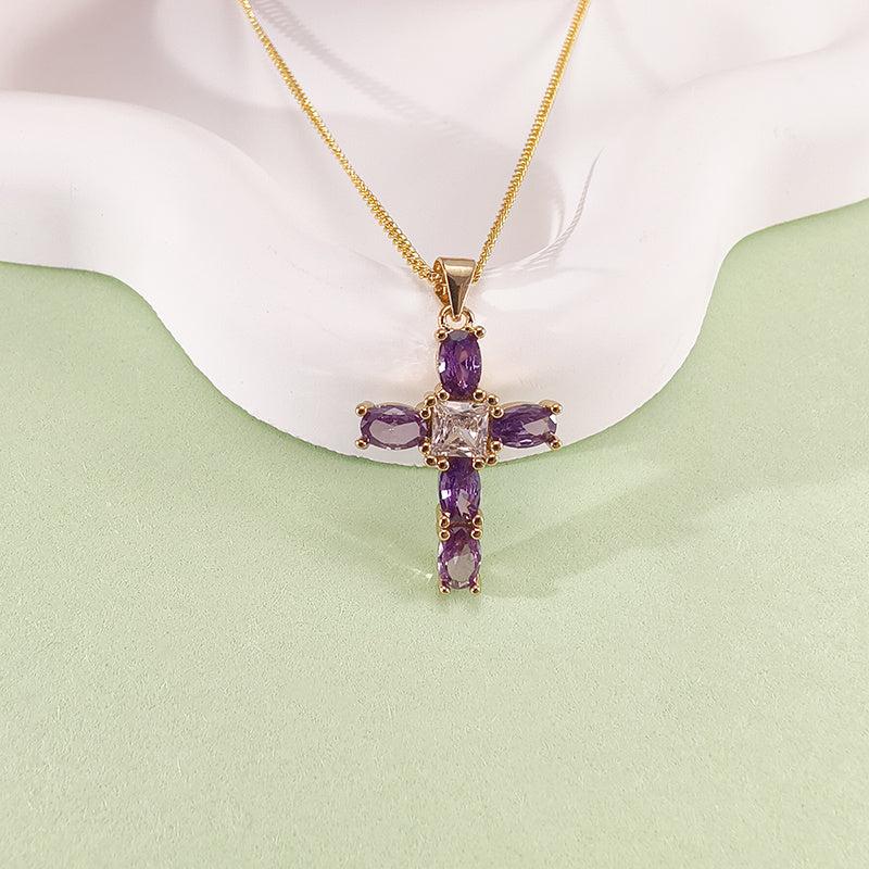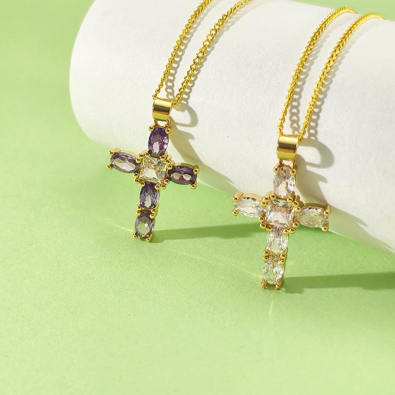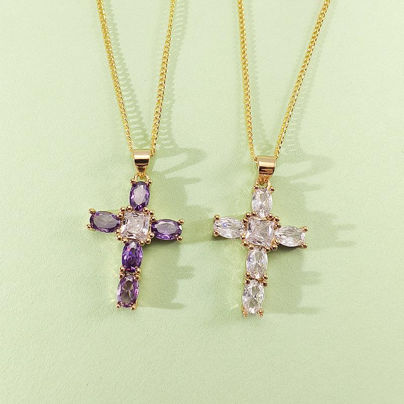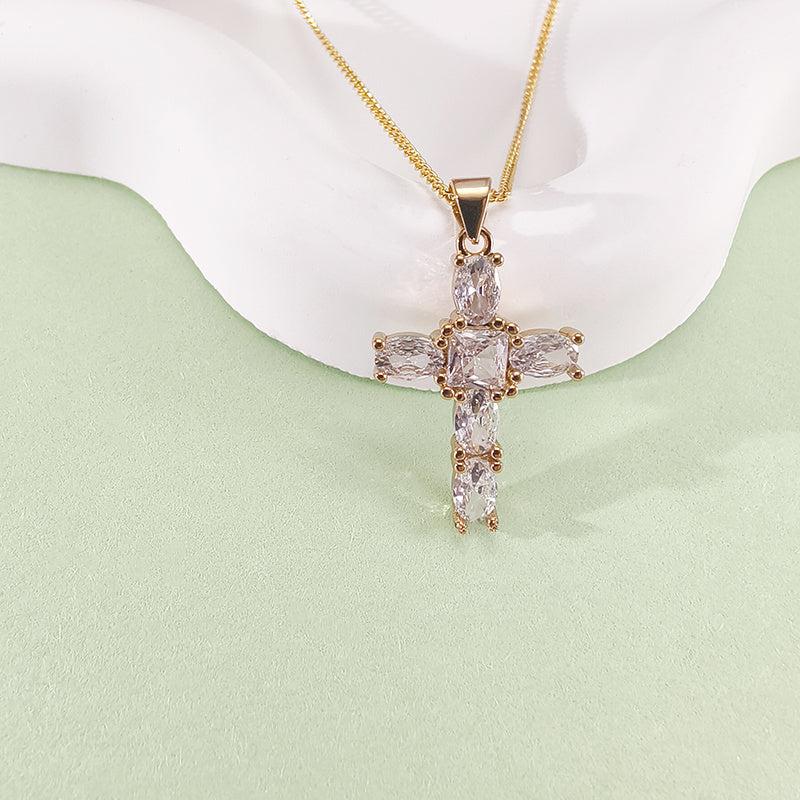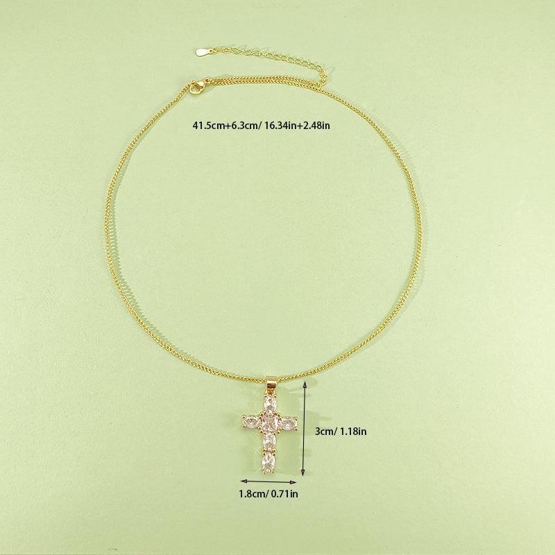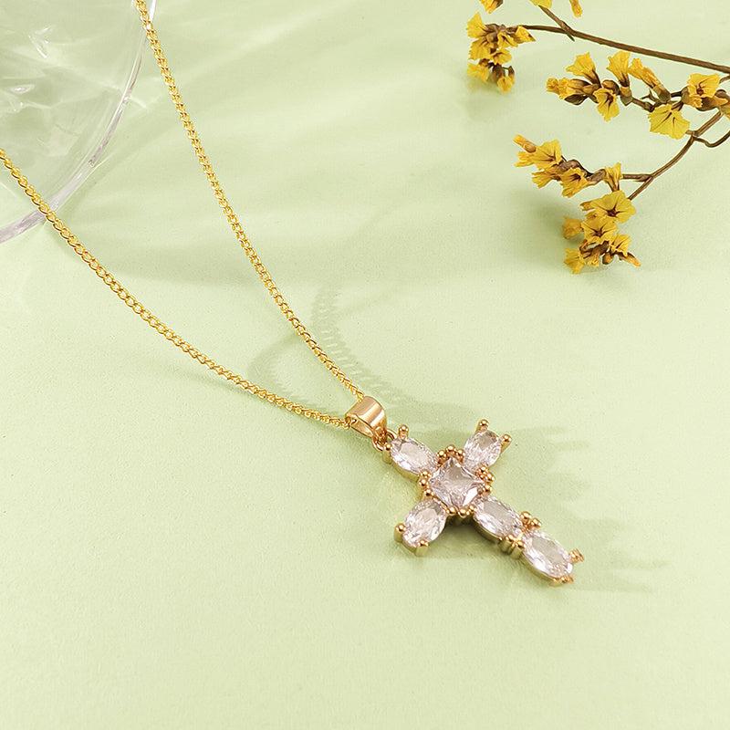 Elegant 18K gold-plated copper pendant necklace featuring a cross design with synthetic cubic zirconia. Perfect for parties and winter occasions.
