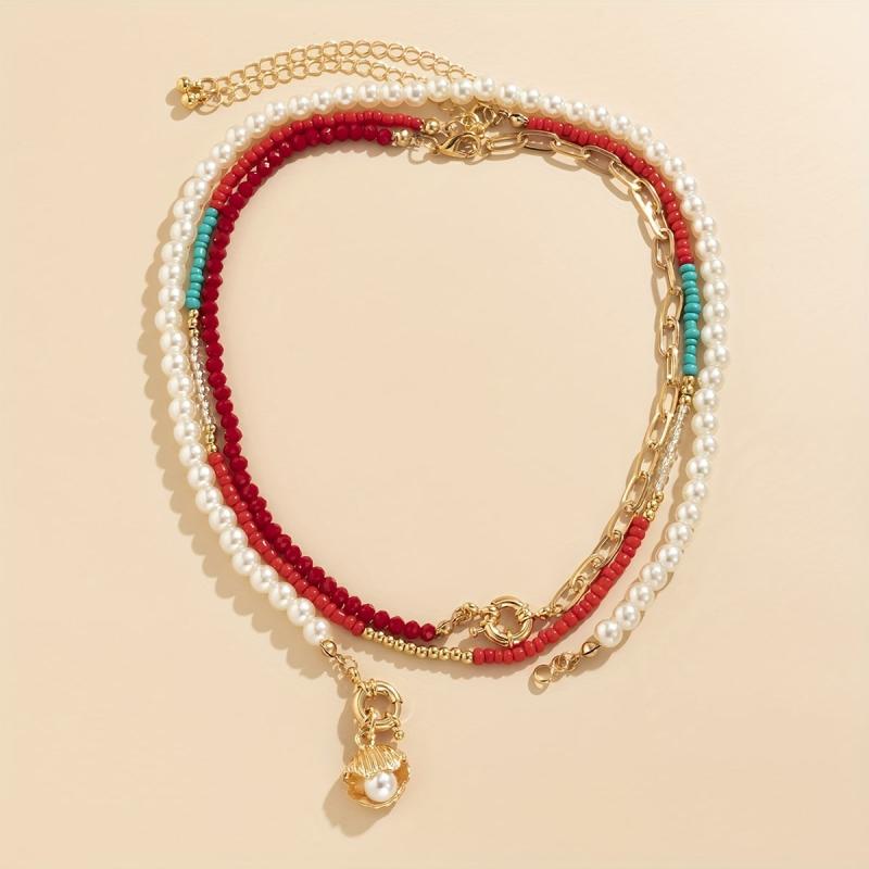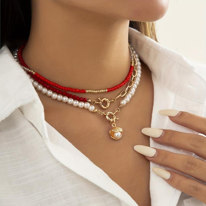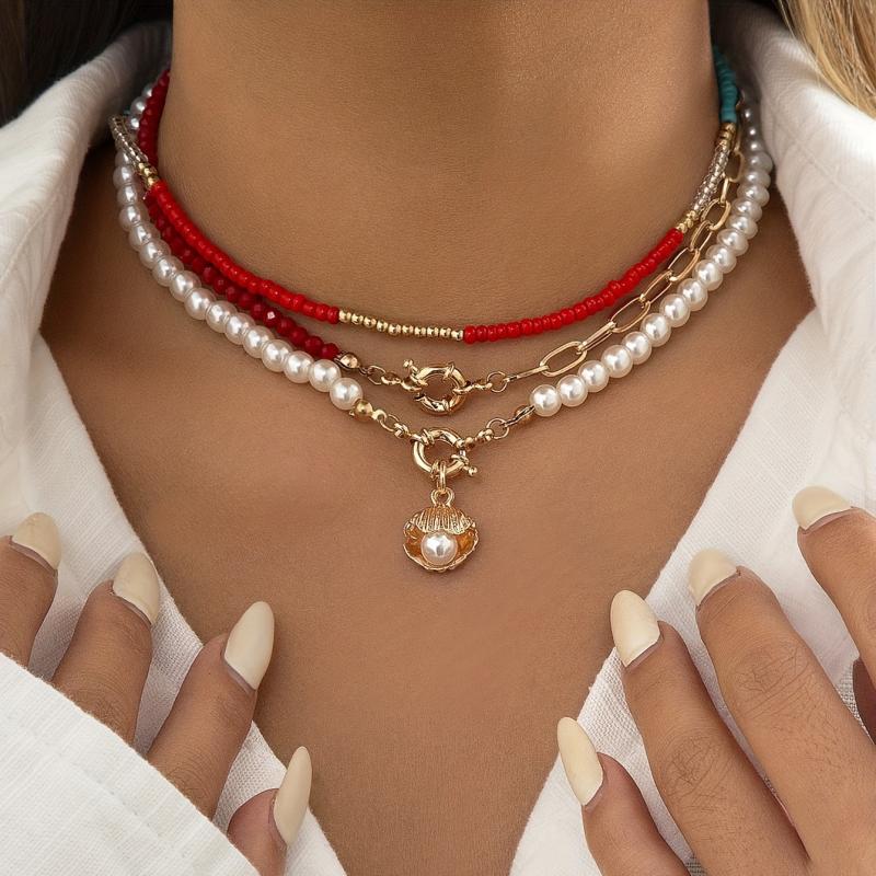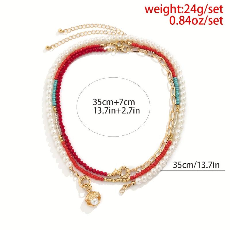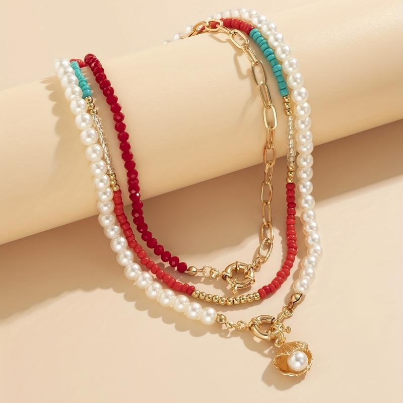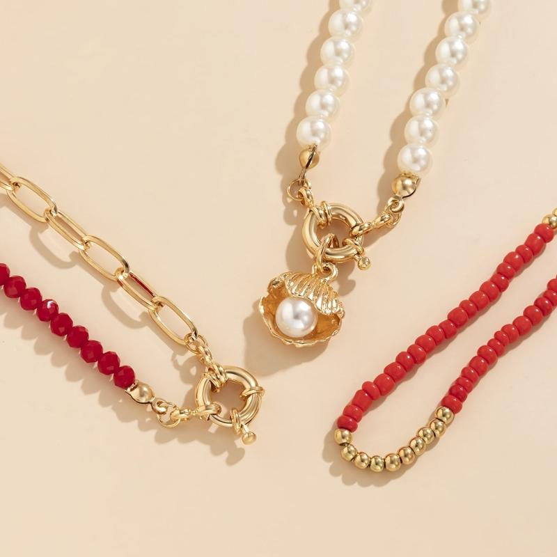 Elegant set of three necklaces with faux pearl and crystal beads, adorned with metal pendants. Perfect for adding a touch of vintage charm to your outfits.