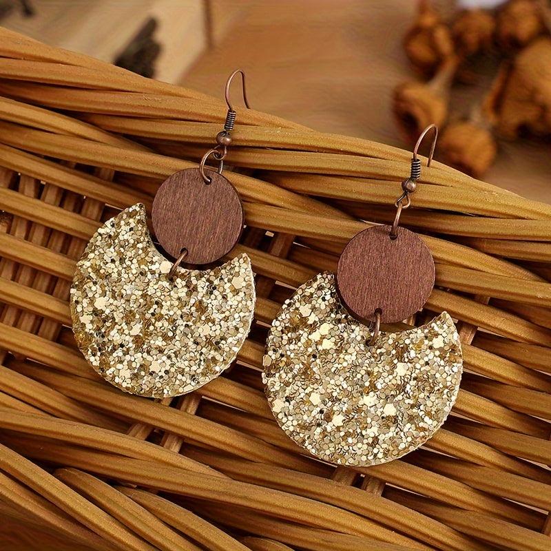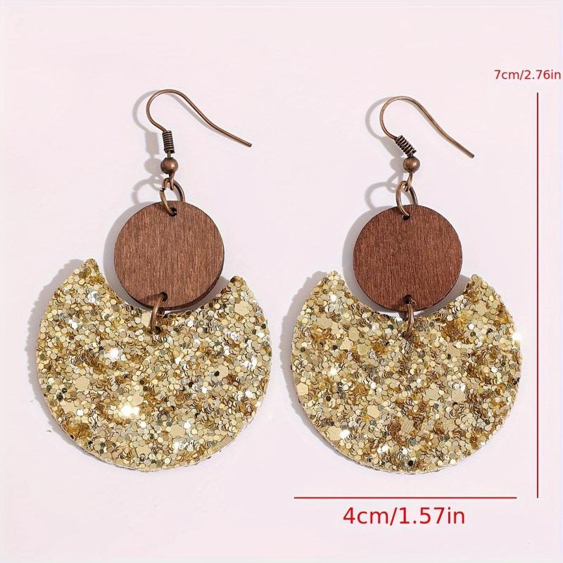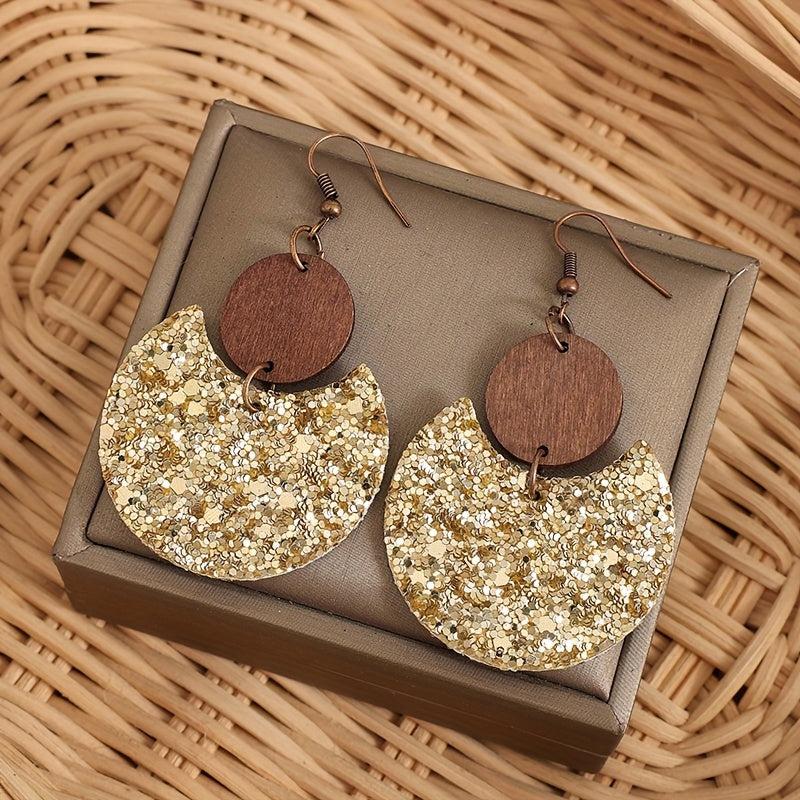 Add a touch of glamour with these Dangle Earrings featuring golden glitter and sequins. The wooden circle detail adds a vintage charm.