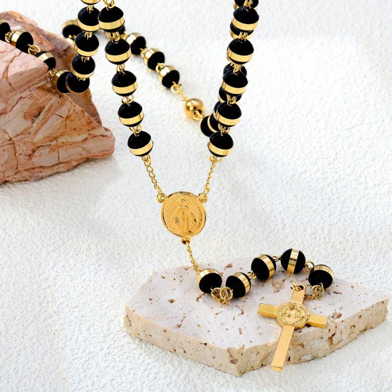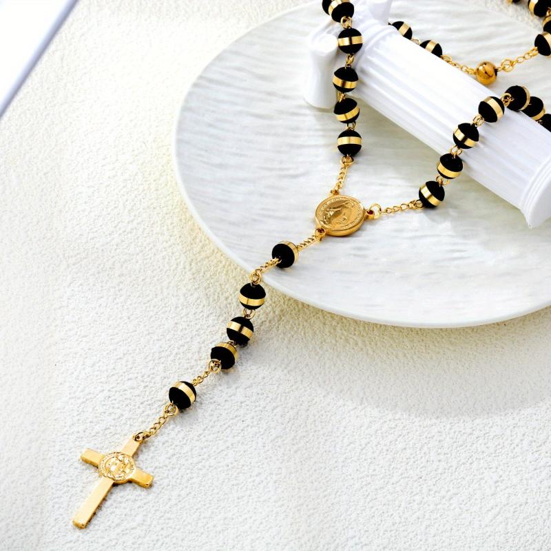 This beaded necklace features a beautiful Virgin Mary cross pendant, making it ideal for both casual wear and evening events. Add a touch of elegance to your outfit with this vintage-inspired piece of jewelry.