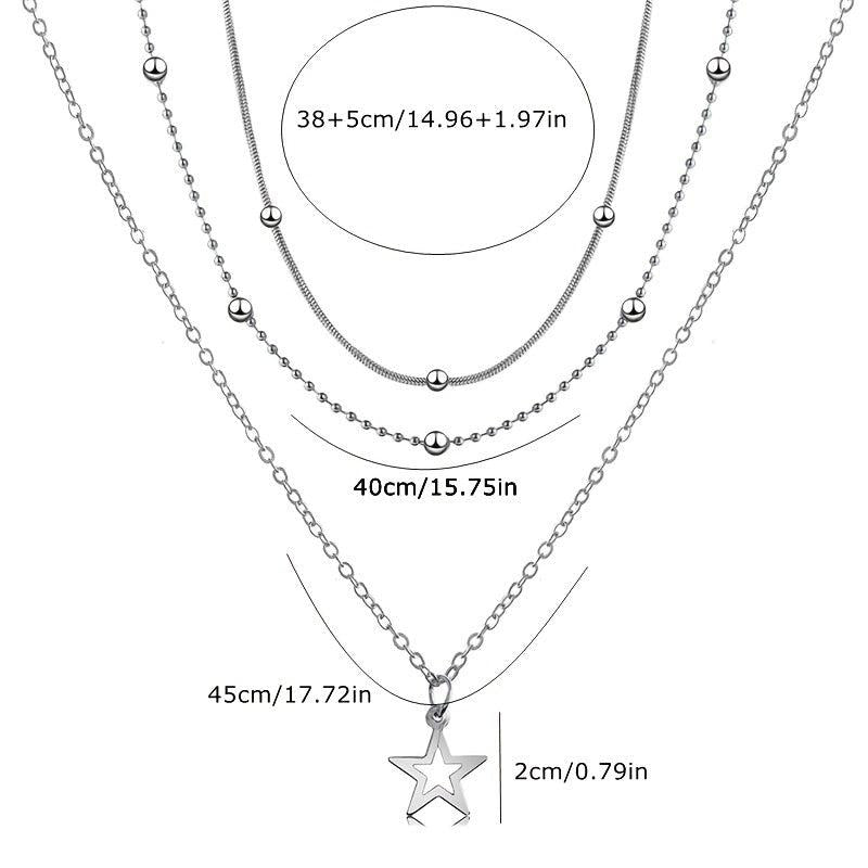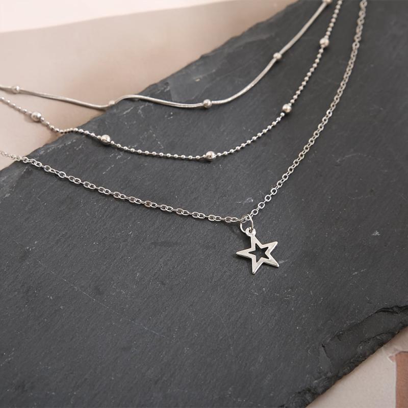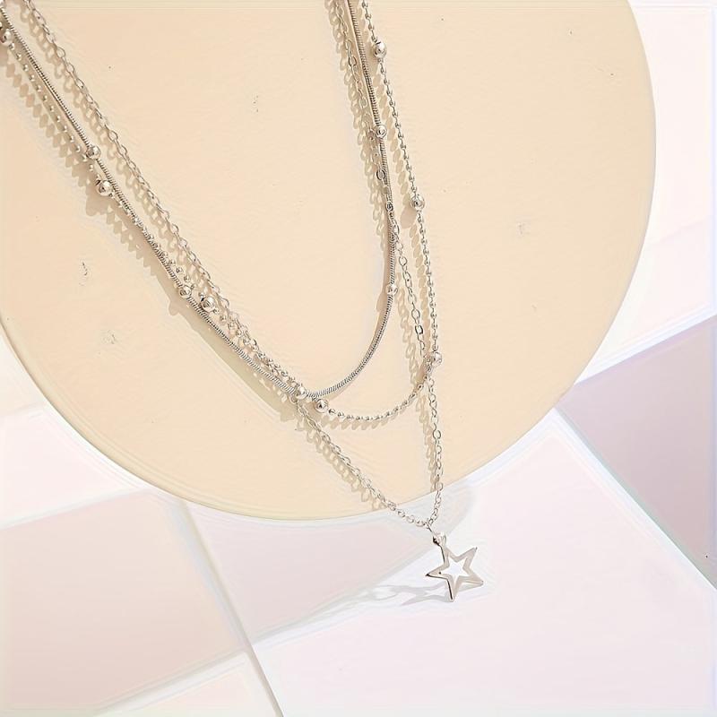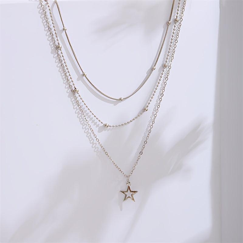 Elegant and vintage-inspired three layer pearl chain necklace featuring a hollowed out five pointed star pendant.