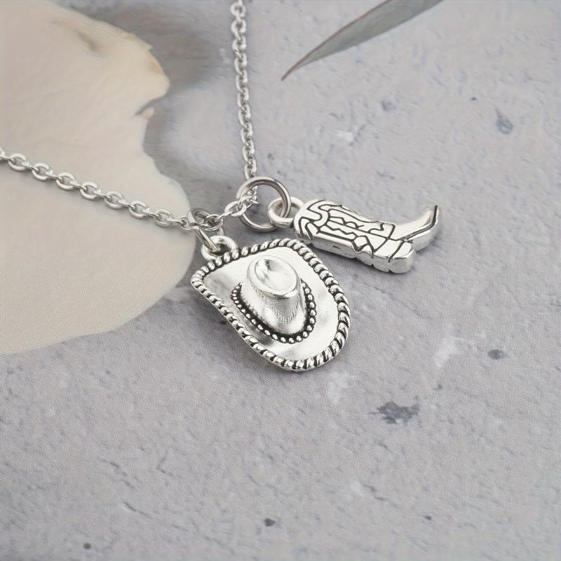 This pendant necklace features a vintage Western cowboy hat and boots design, perfect for cowgirl and cowboy enthusiasts.